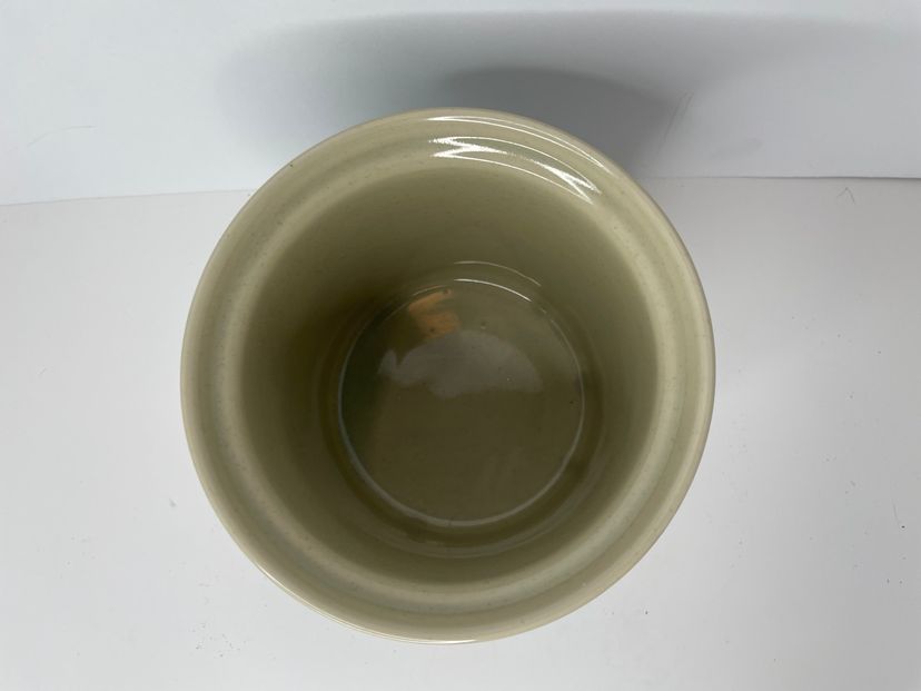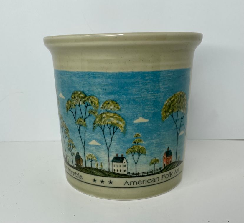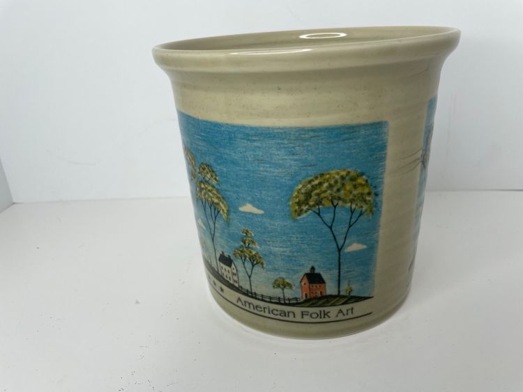 This vintage Otagiri crock is a charming utensil holder with a touch of Americana. The round stoneware crock features a beige color and American Folk Art pattern, perfect for adding a farmhouse style to your kitchen decor. Measuring 5.75 inches at the top and 5 inches at the bottom, it's a medium-sized crock that can hold your essential kitchen tools.
