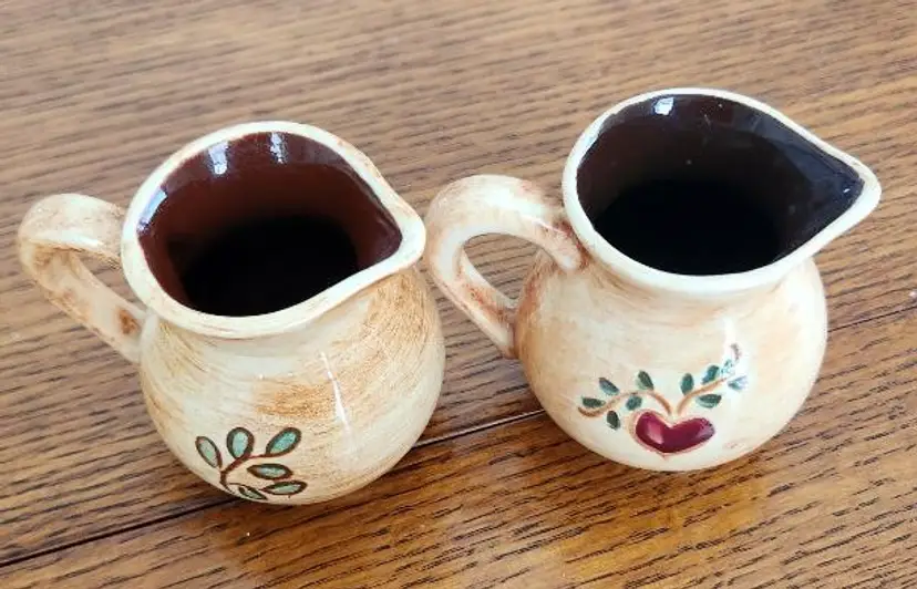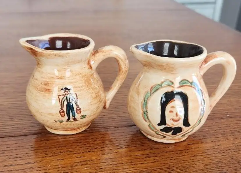 VTG Pennsbury Pottery Creamers featuring hand painted American folk art style from Morrisville, PA 1950-1970's 2 1/4" tall Tan & Brown featuring Amish Farmer and Amish Woman painted on creamers