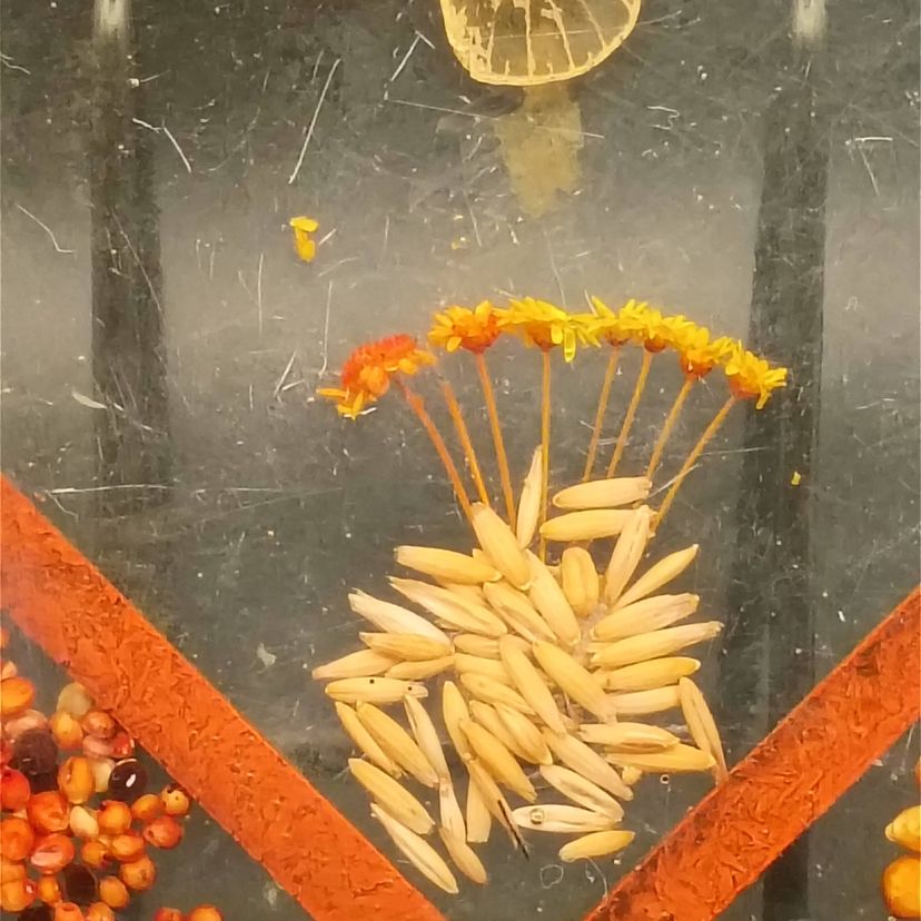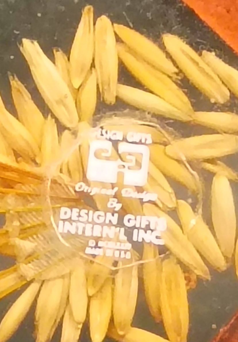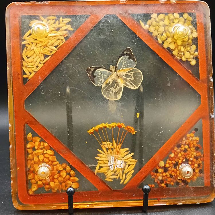 The product is a vintage retro mid-century modern (MCM) resin acrylic trivet square measuring 7 1/2 inches, featuring a decorative design of seeds, grains, and butterfly. Produced by Resin Gifts International Inc, this trivet is suitable for all occasions and adds a unique touch to the kitchen or dining area. The resin material gives it a sturdy and durable construction, while the butterfly theme adds a whimsical and charming element to its aesthetic appeal. Preowned: There are chips and flea bites to the underside rim of the trivet. There may be some scratches due to the age of the trivet