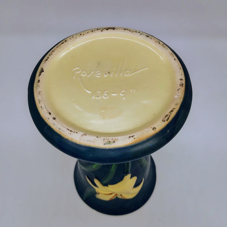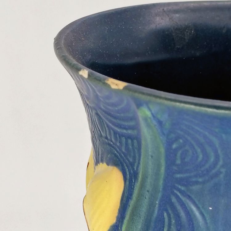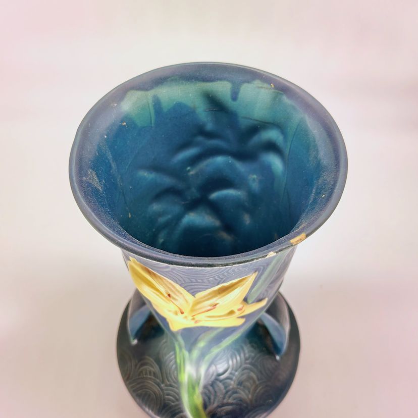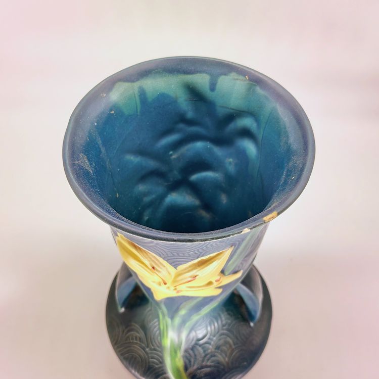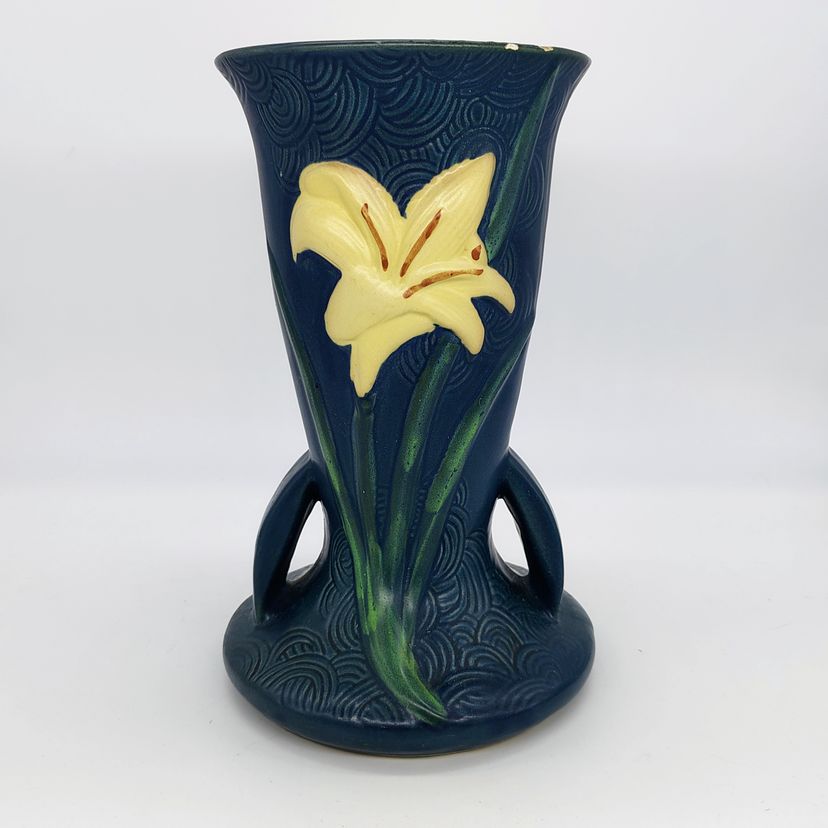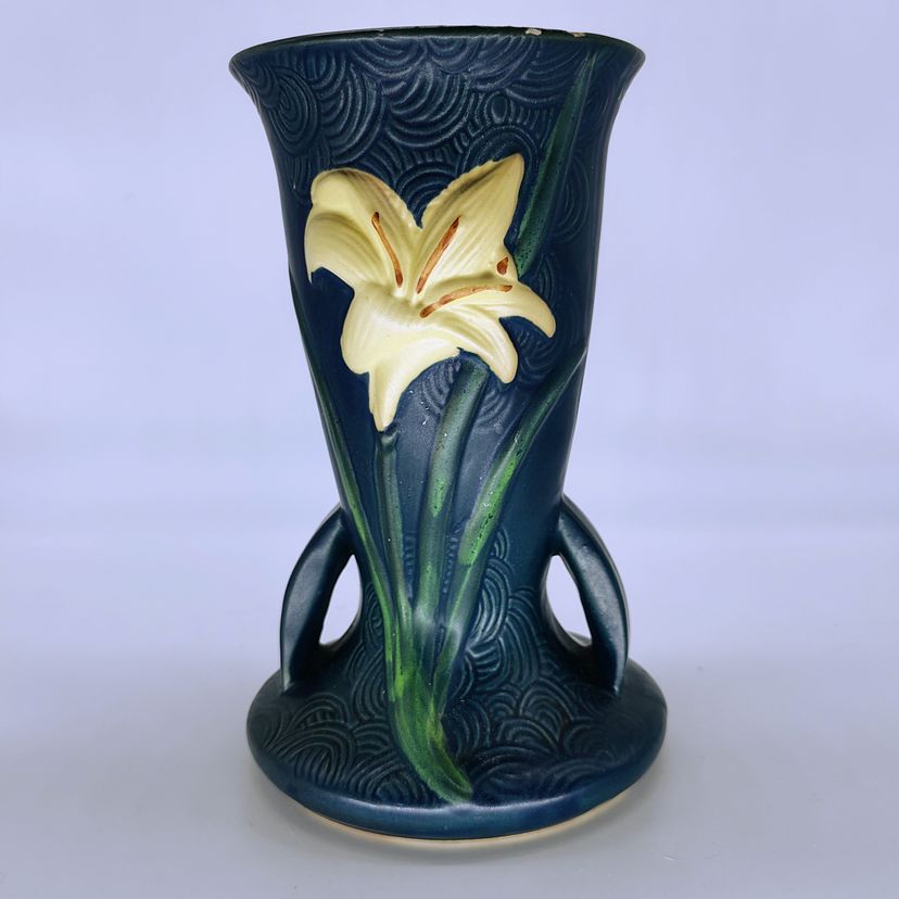 This Roseville Vase is in stunning blue with white lillys. There are 2 flea bite chips on the rim as pictured.