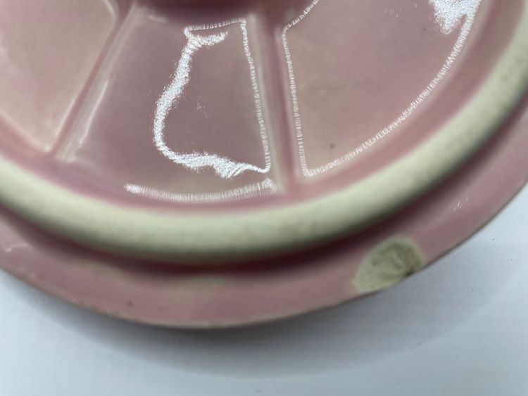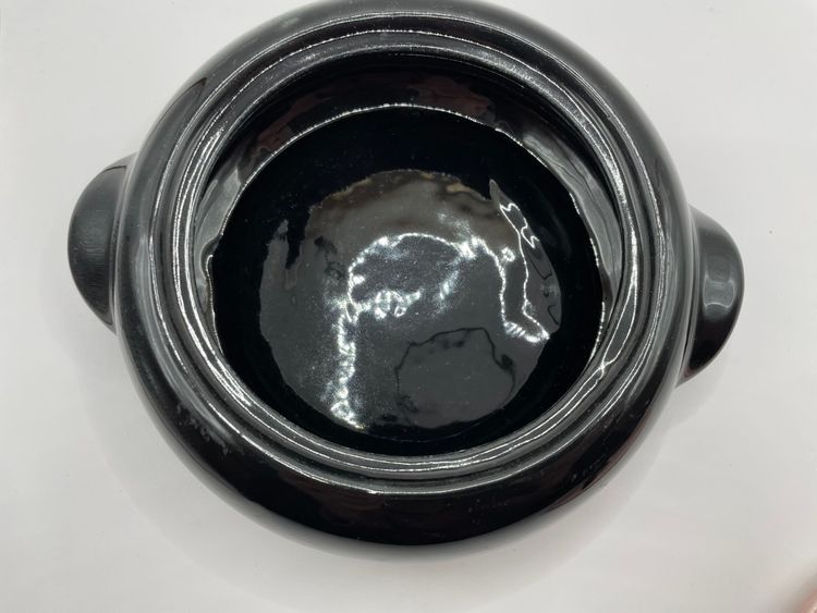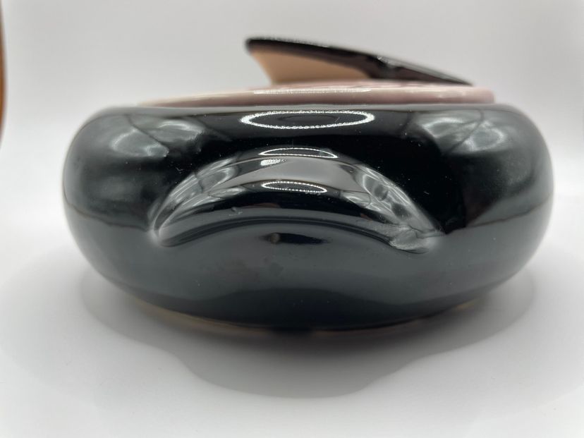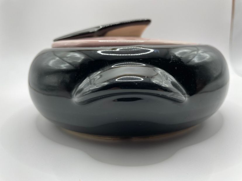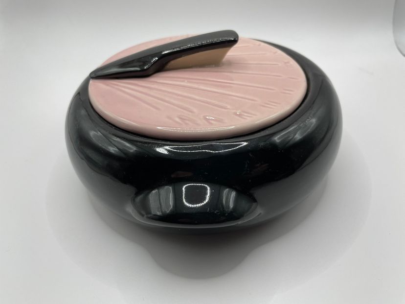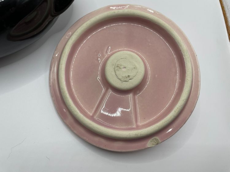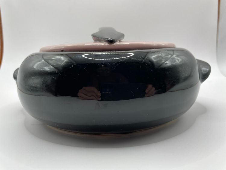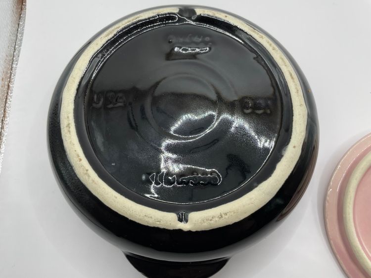 The VTG Shawnee Kenwood Pottery 1950s Sundial Pink Black Casserole Dish is a vintage piece of Mid-Century Modern decor. Made in the 1950s in Zanesville, this art pottery casserole dish features a round shape with a decorative Sundial pattern in black and pink colors. The glossy finish and Lug handles add to its charm, making it a unique and stylish addition to any kitchen or dining table. This .5 Quart covered dish is an original production of Kenwood Pottery, showcasing the Art Deco style popular in that era.