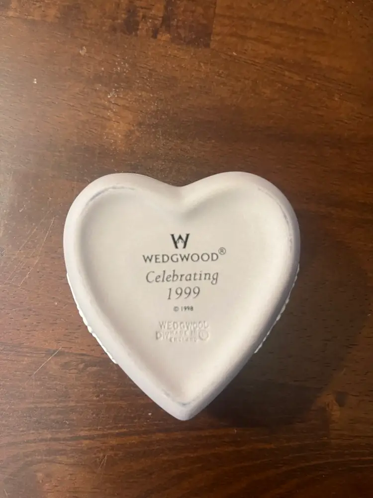 This particular heart-shaped trinket box, made from lilac Jasperware with white sprig decoration, is a classic example of Wedgwood's enduring design aesthetic. The motif of a heart pierced by an arrow, often associated with love and romance, is a popular theme for such decorative items. The presence of the original box and the 'Celebrating 1999' reference suggests it might be a commemorative or limited edition piece from the late 20th century.