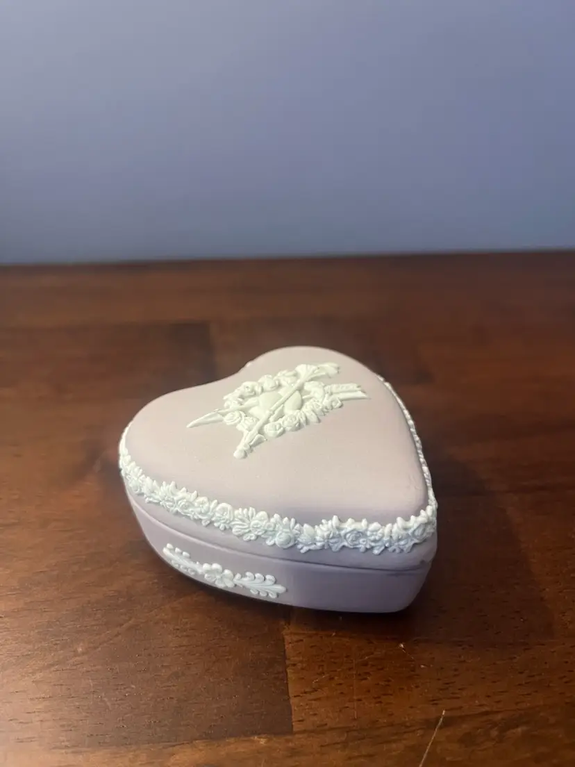 Wedgwood lilac Jasperware heart trinket box with white floral relief. 1.25”h 3” W #2