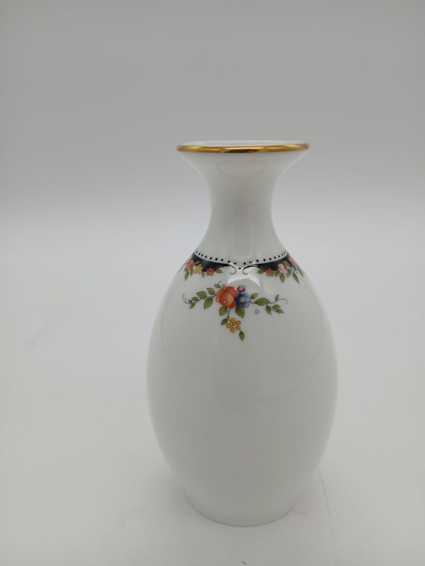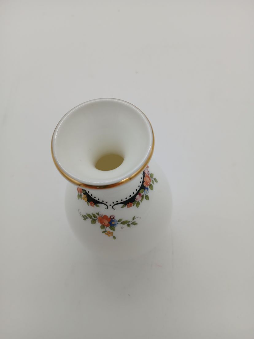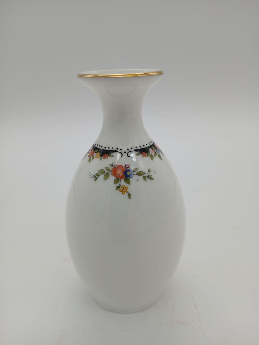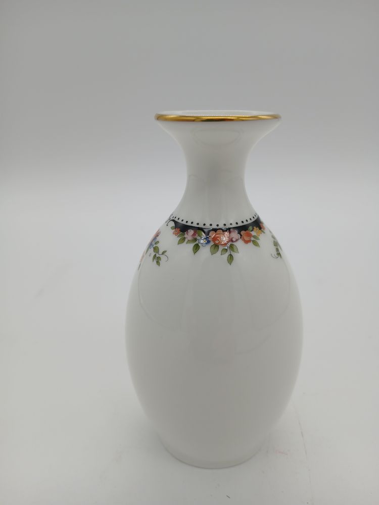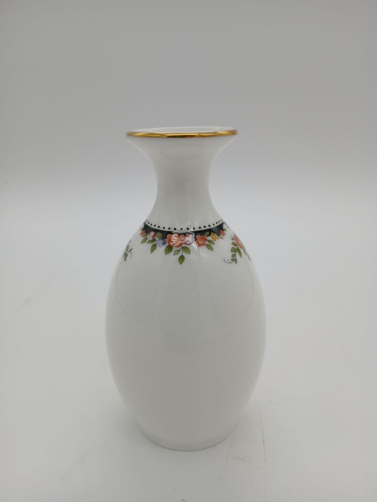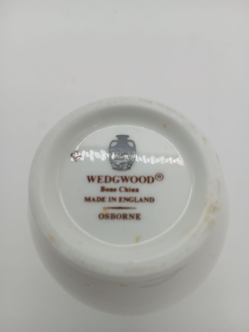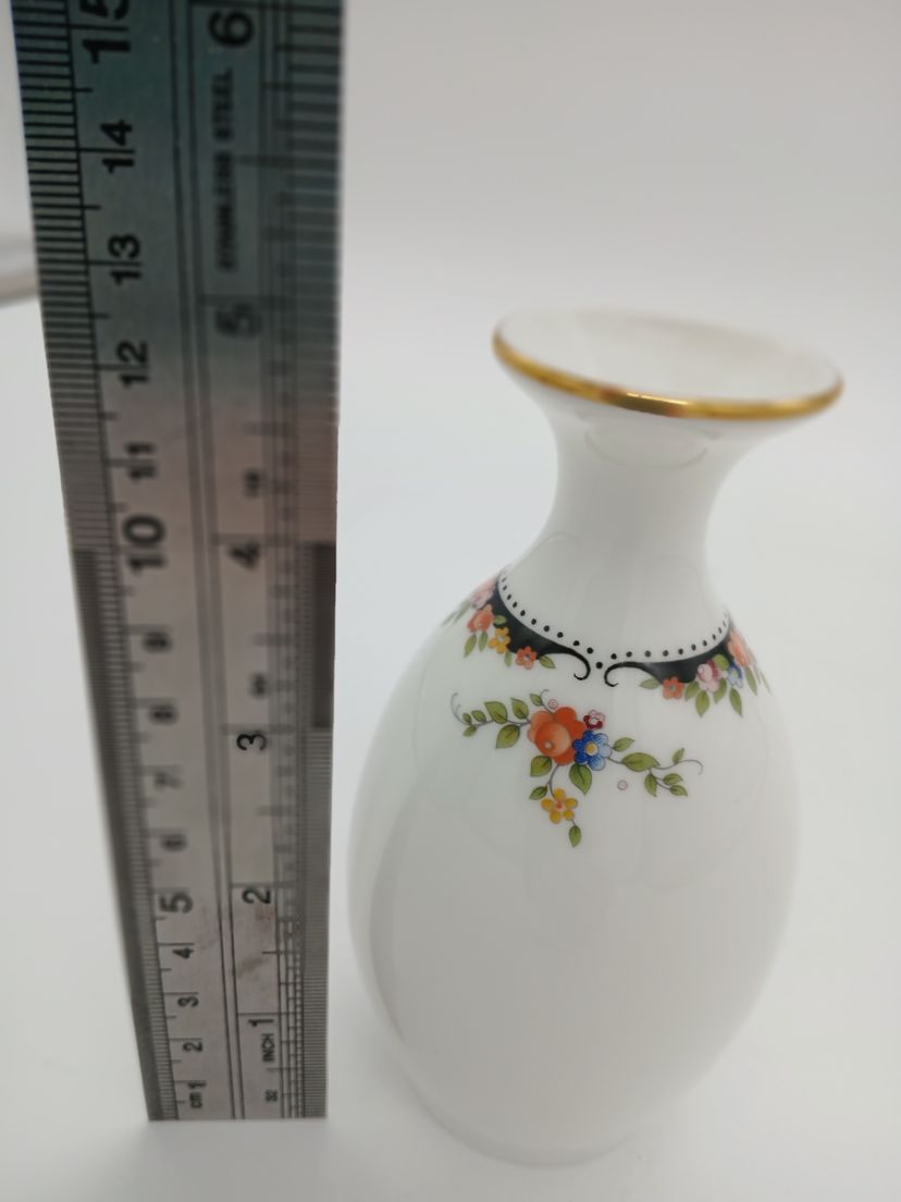 So Pretty. White with gold rim and floral design. Perfect condition with no chips, cracks, or other signs of wear. About 5" tall.