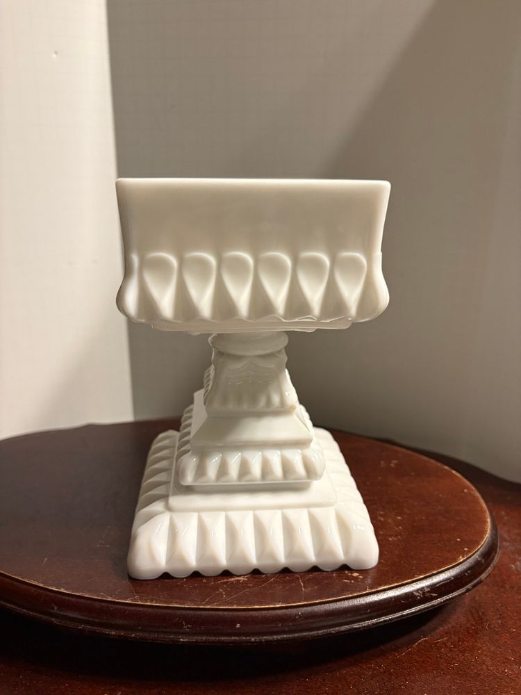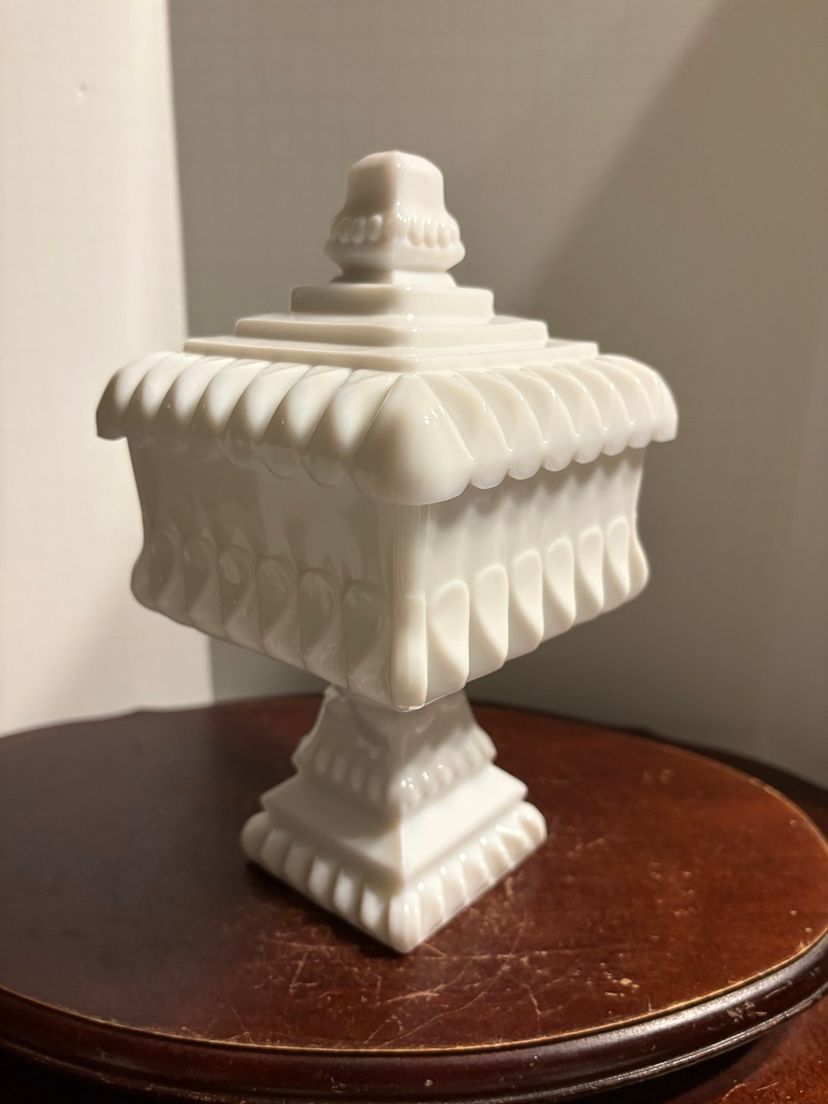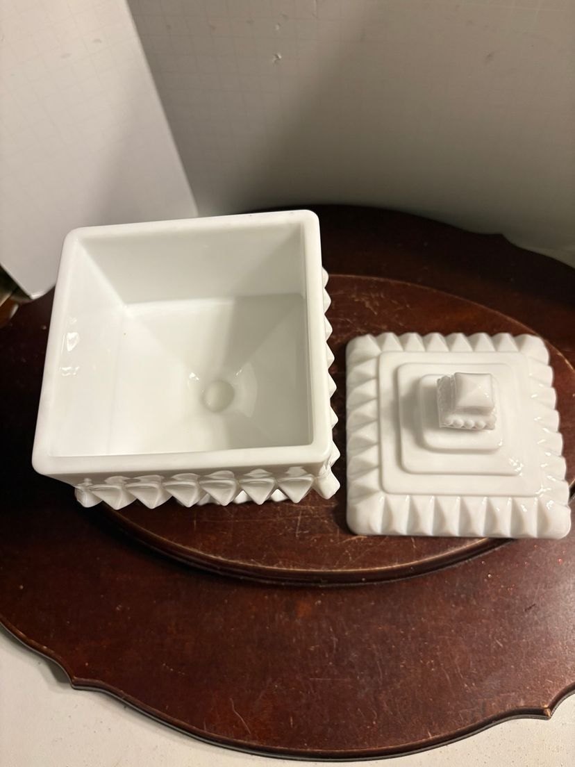 8” tall with lid, box is 4” square. No chips or cracks, marked under lid.