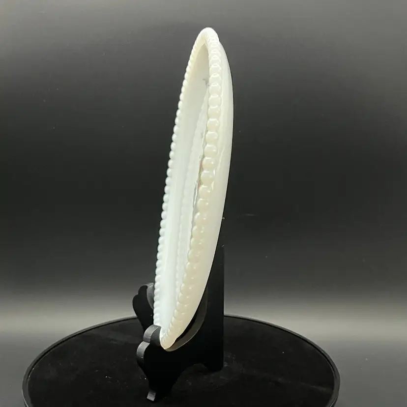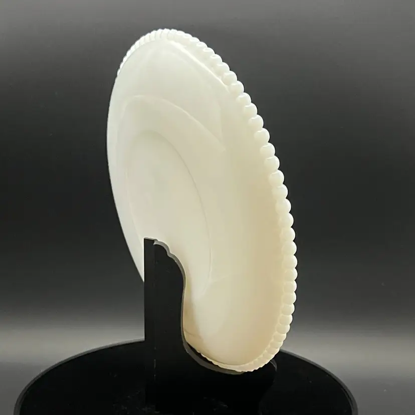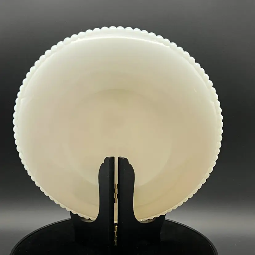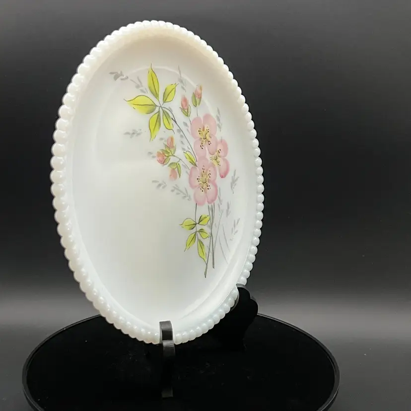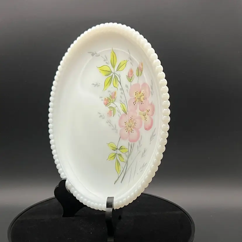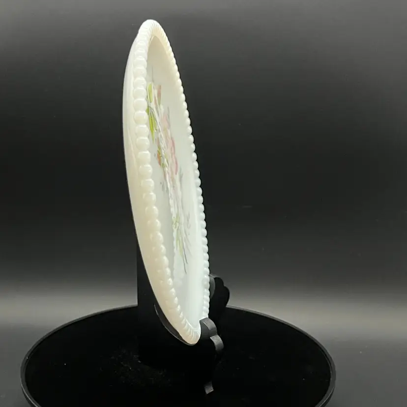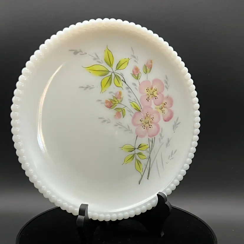 This plate is so pretty! The pink floral design is a great fit with the bright white milk glass. This piece is not signed. It measures 7.5” in diameter and there are no call outs.