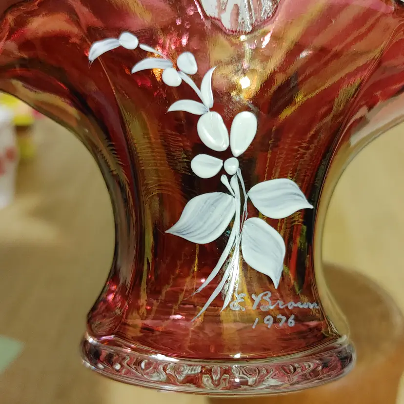 Westmoreland Ruby Floral glass basket. Signed 1976. 7 in high. No chips or cracks.
