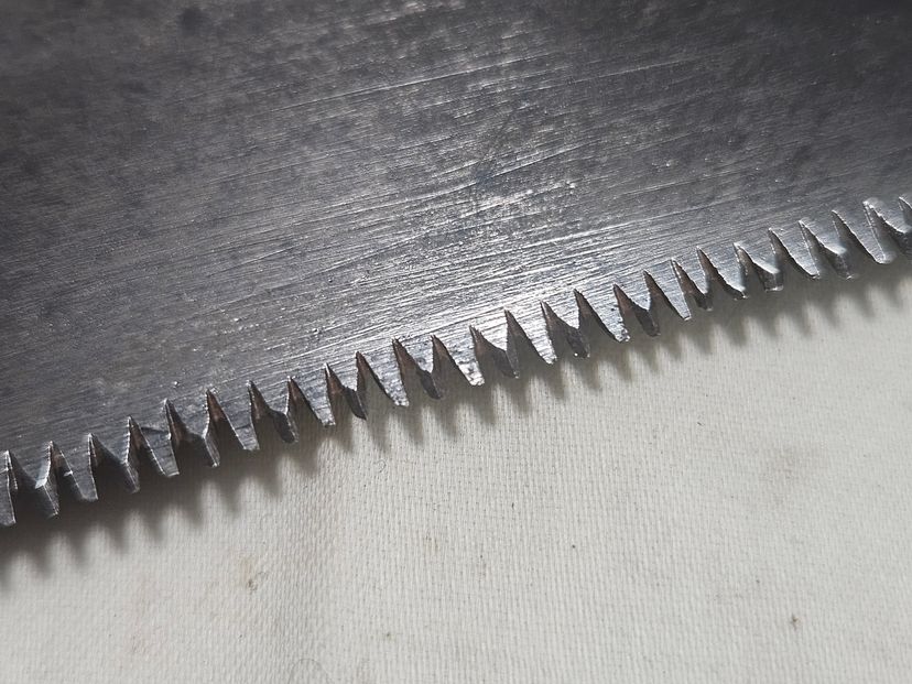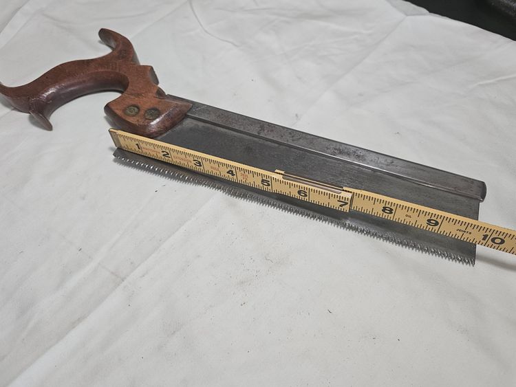 Hybrid tooth pattern. 2 inch under the spine. Wood handle is in excellent condition. Some pitting on the marked saw of the saw plate as shown in the photos.
