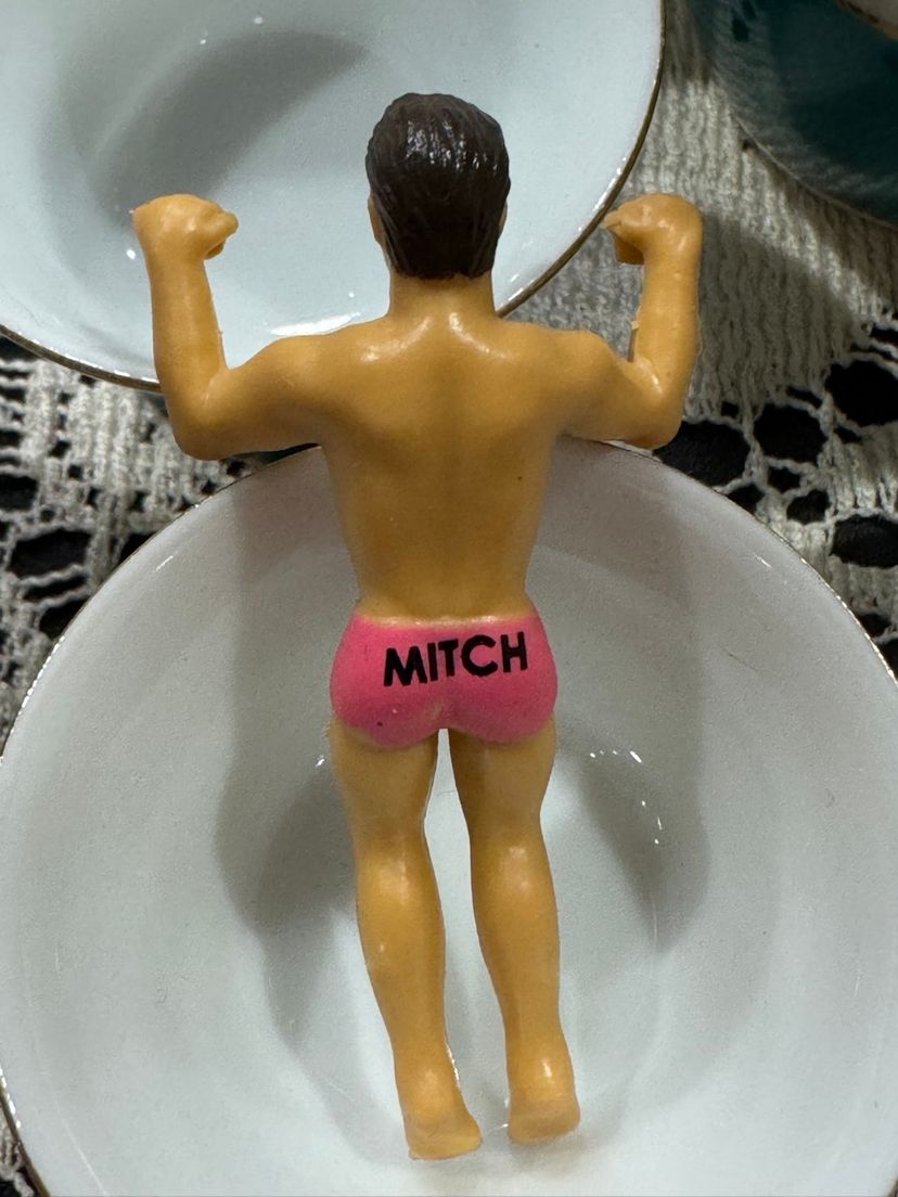Set of 6 wine glass charms, each with a man’s name on the back of their trunks to help you keep track of your glass! About 2 inches tall, they hang from the glass with curved hands, best for thinner rimmed glasses. Made of a pliable material.