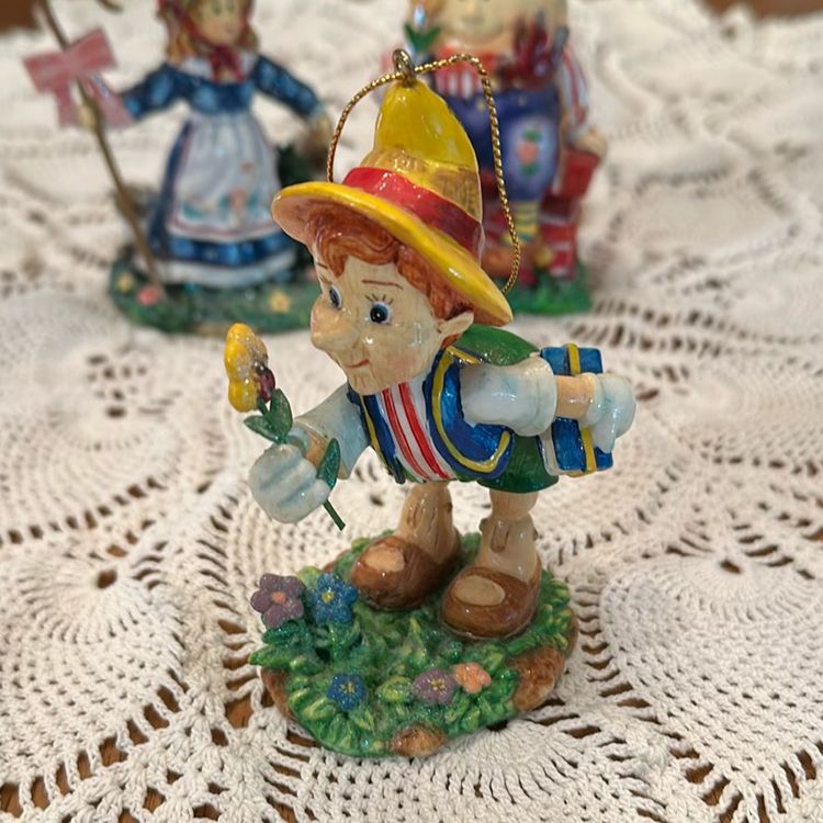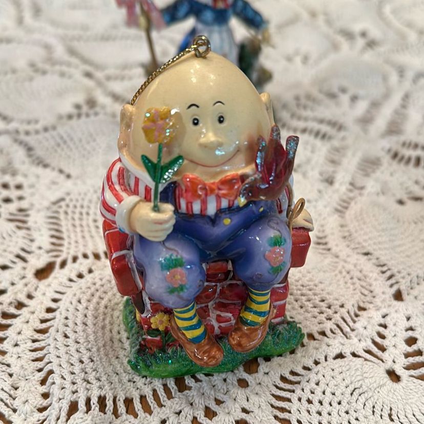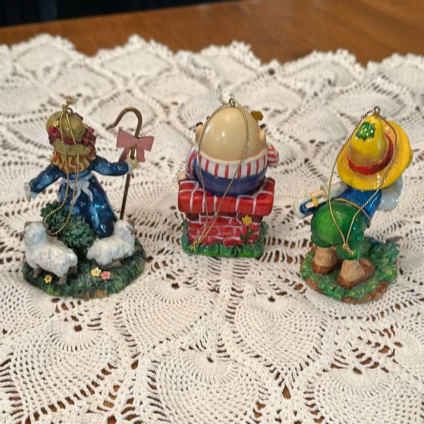 Whimsical and charming set of 3 nursery rhyme ornaments features classic nursery rhymes and characters from the Mother Goose collection. The ornaments are designed as shelf setters Or hanging ornaments, adding a decorative touch to any nursery or child's decor or your Christmas tree