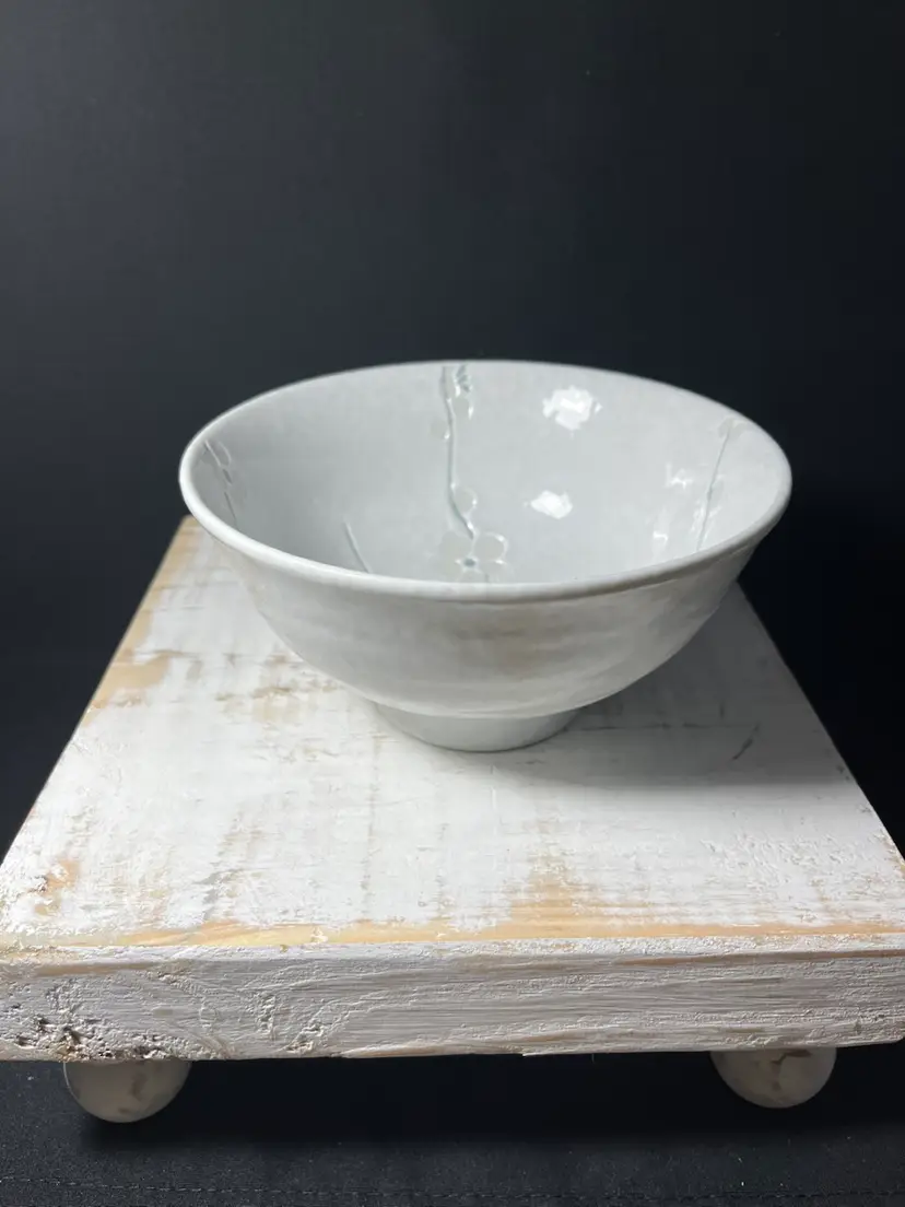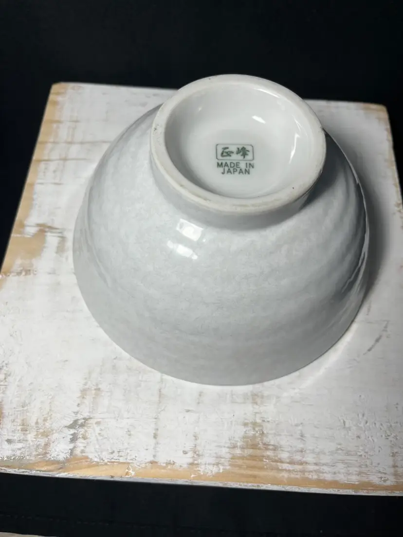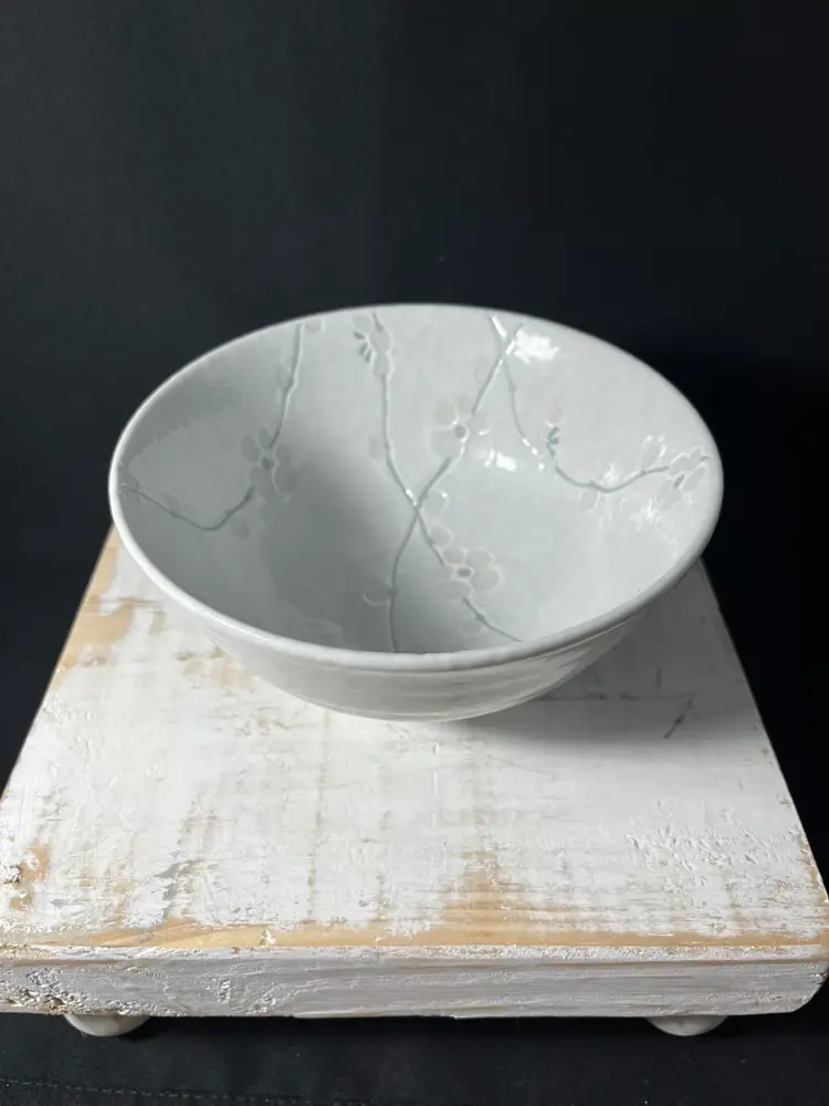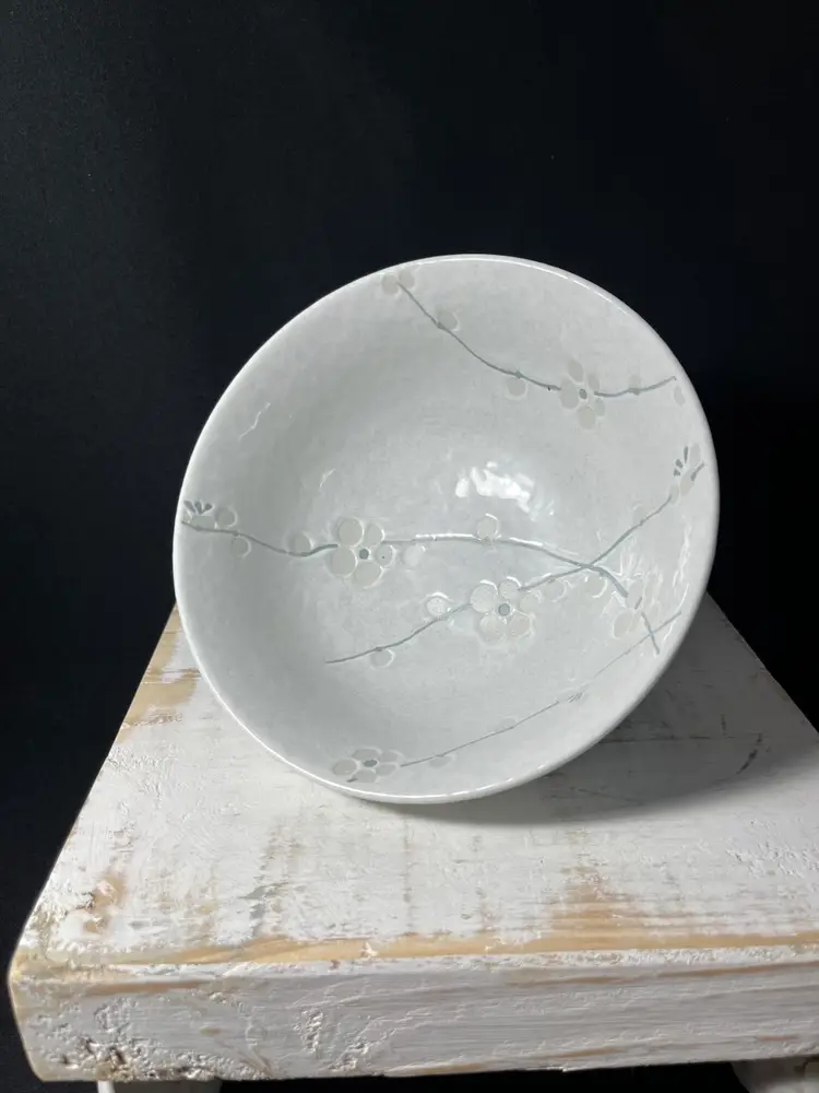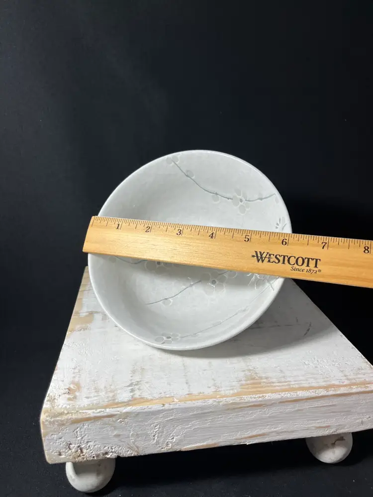 #969 White Ceramic Bowl With White Cherry Blossoms And Blue Stems. Made in Japan. Measures 3” x 6”.