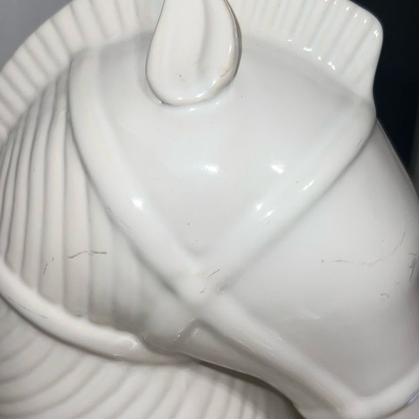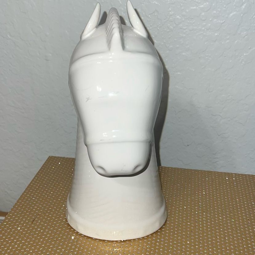 One white ceramic Knight Horse Head Bookend. Stands almost 10" tall. Solid and heavy. No chips but does have some slight rub marks.