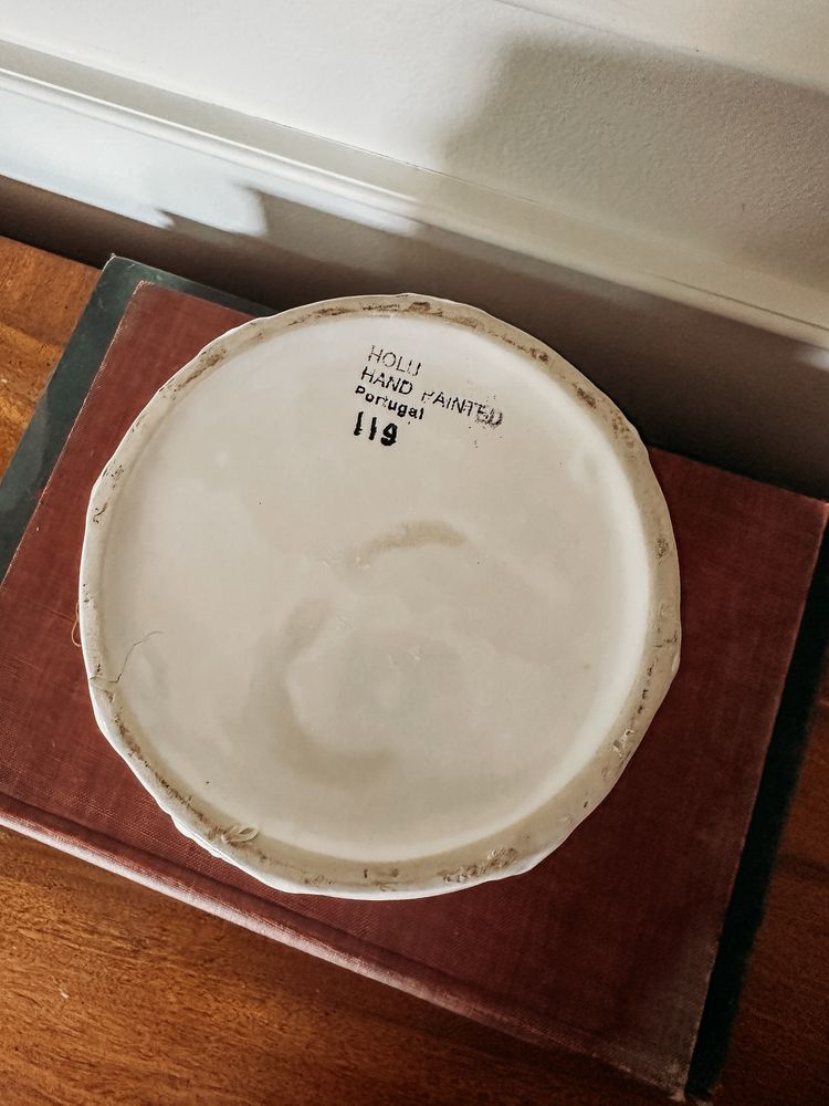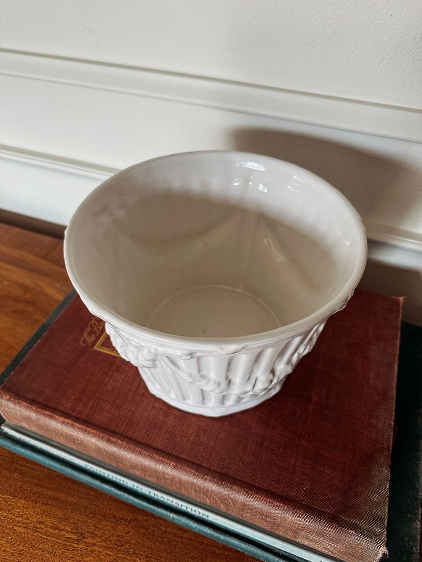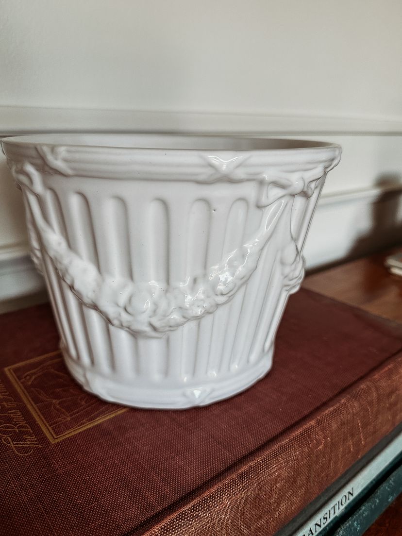 This planter pot has so much lovely detail! Garlands or boughs swoop from one ribbon to the next at the rim. There are also small X's at the top and bottom and a raised stripe pattern the entire way around the planter. Can use all year round, but these piece reminds me of the holidays and looks GORGEOUS filled with evergreens, a poinsettia, or a Christmas cactus!