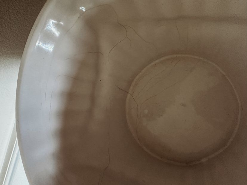 8" wide at the top, 5.75" tall. Has one small chip on the bottom of the pot and some large crazing on the interior.