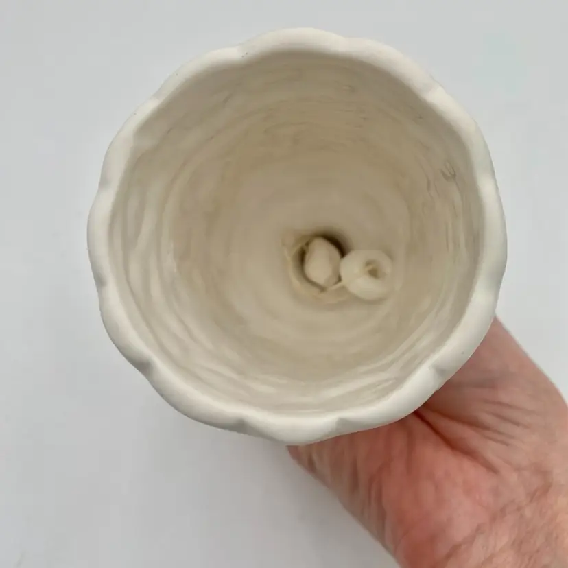 This white or light Ivory Porcelain Bell features a charming design of applied, sculpted roses on the bell, with an embossed floral pattern on the remainder of the body. The bell is perfect for all occasions, with a Victorian style and a glossy finish, making it ideal for wedding decor or home decor. The bell is 6 inches high and 2.8 inches wide, showcasing intricate details and a scalloped base.