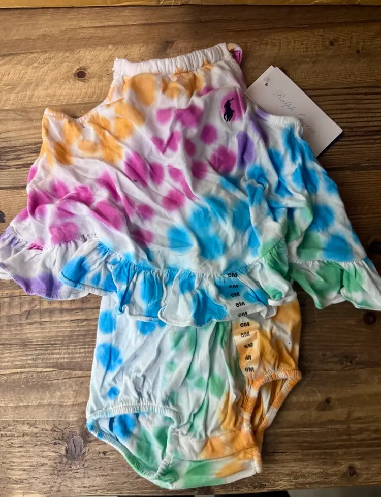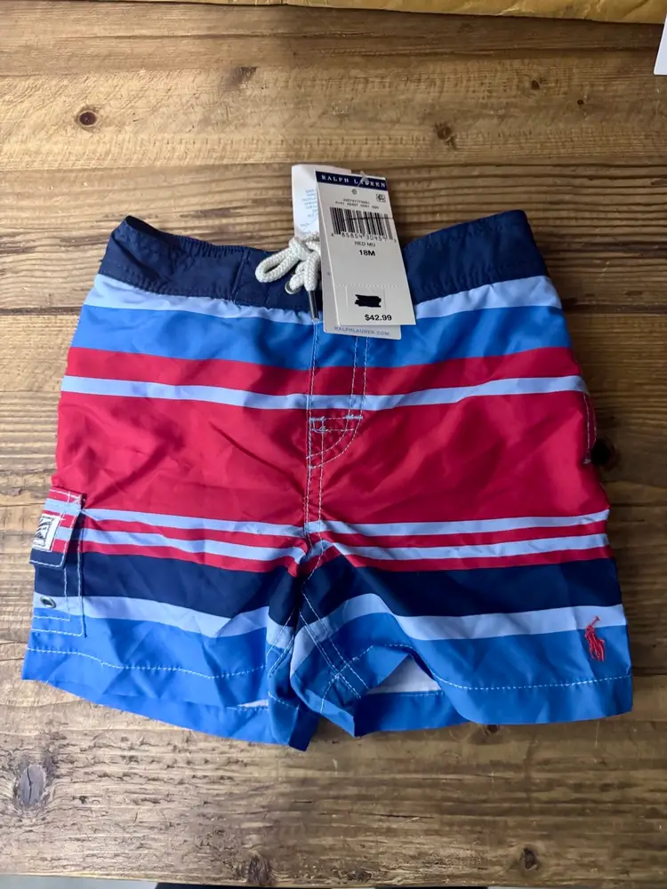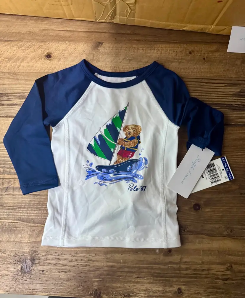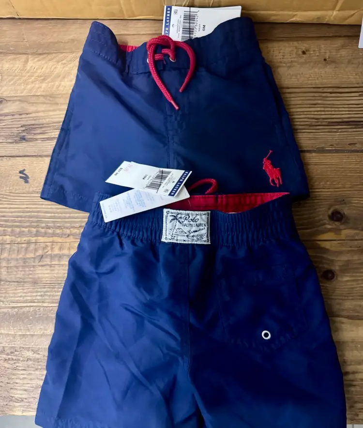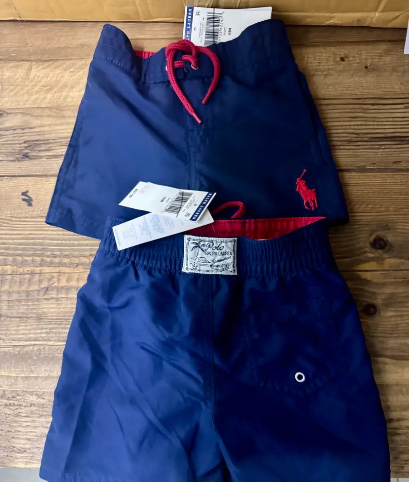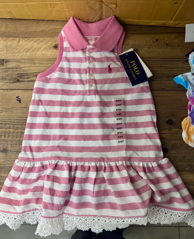 Wholesale lot of kids’ clothing – includes a mix of boys’ and girls’ items, mostly polo shirts with some swimwear pieces mixed in. All items are new with tags, though some tags may be marked or clipped (see photos for details).