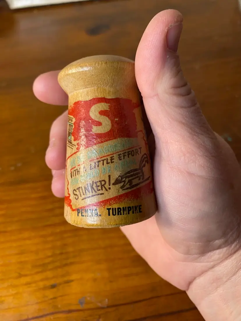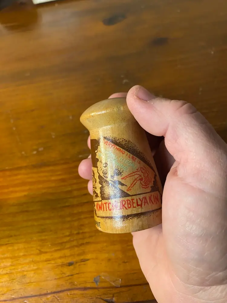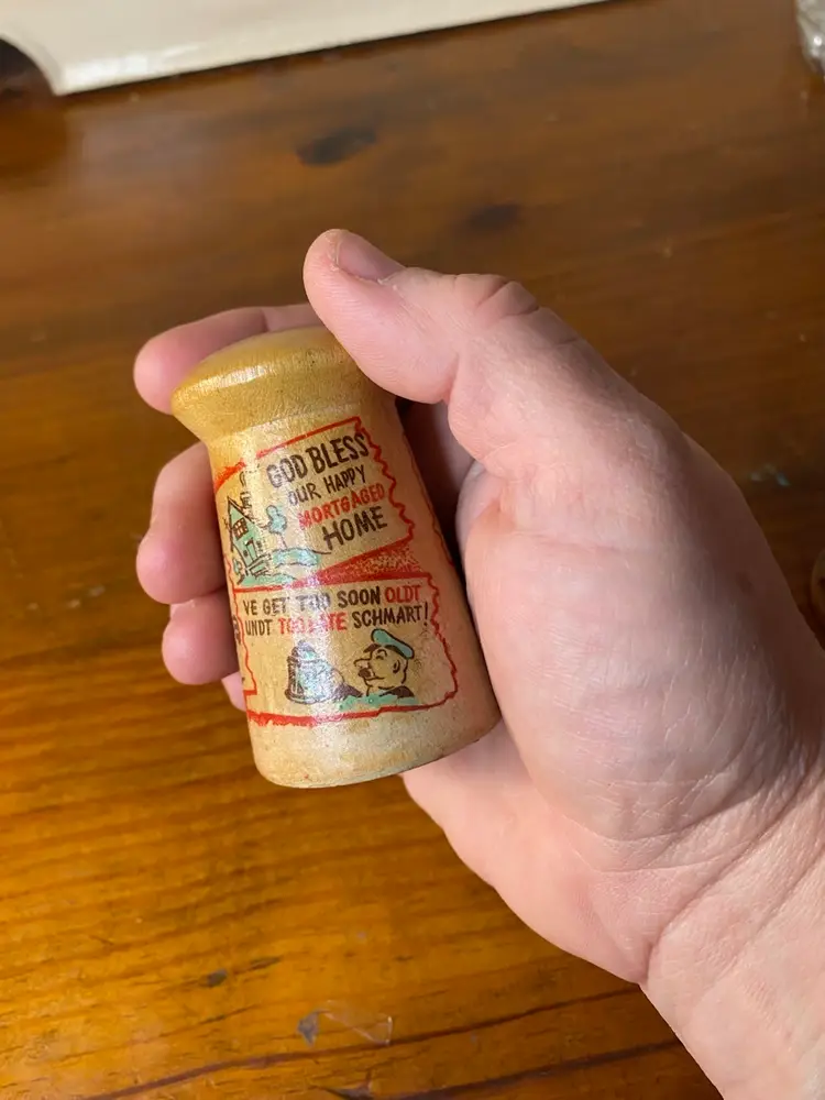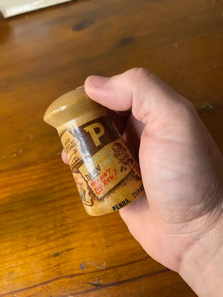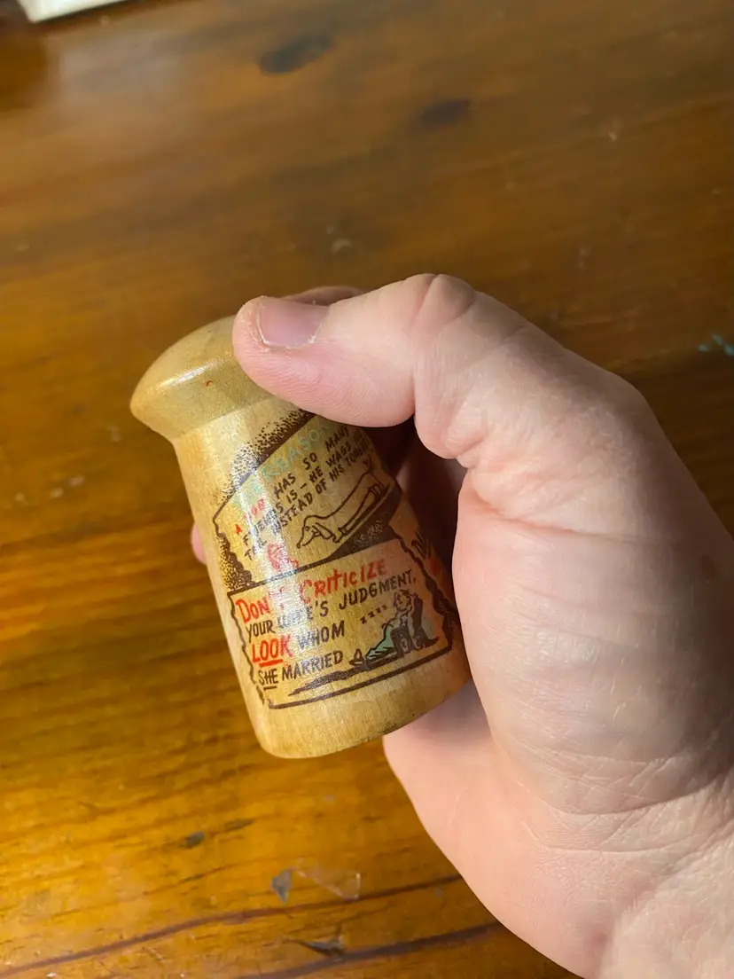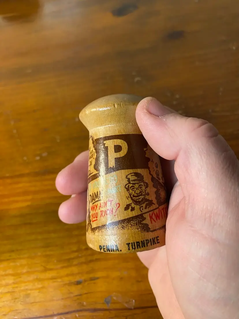Vintage Will Roger’s salt and pepper wooden shakers, corks are intact.