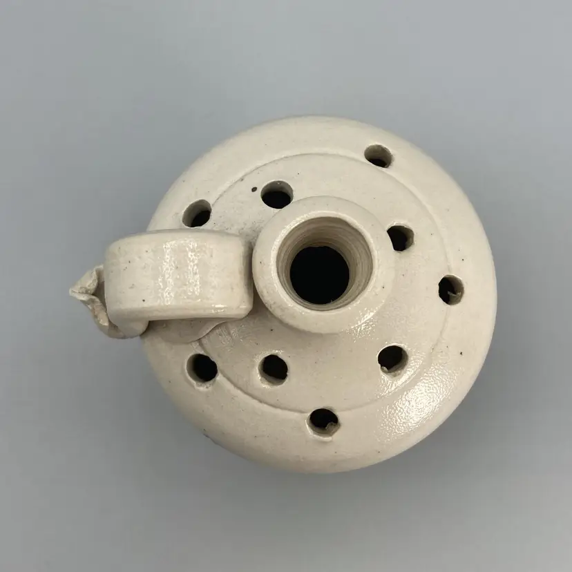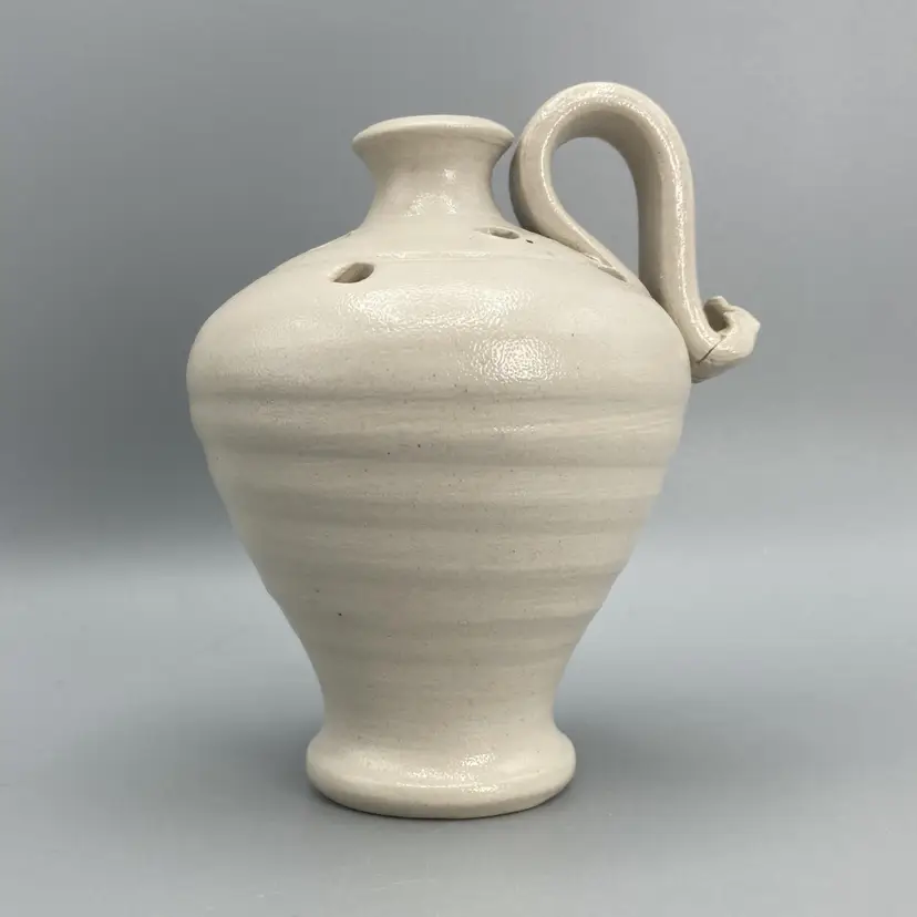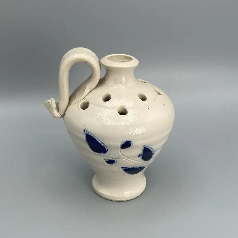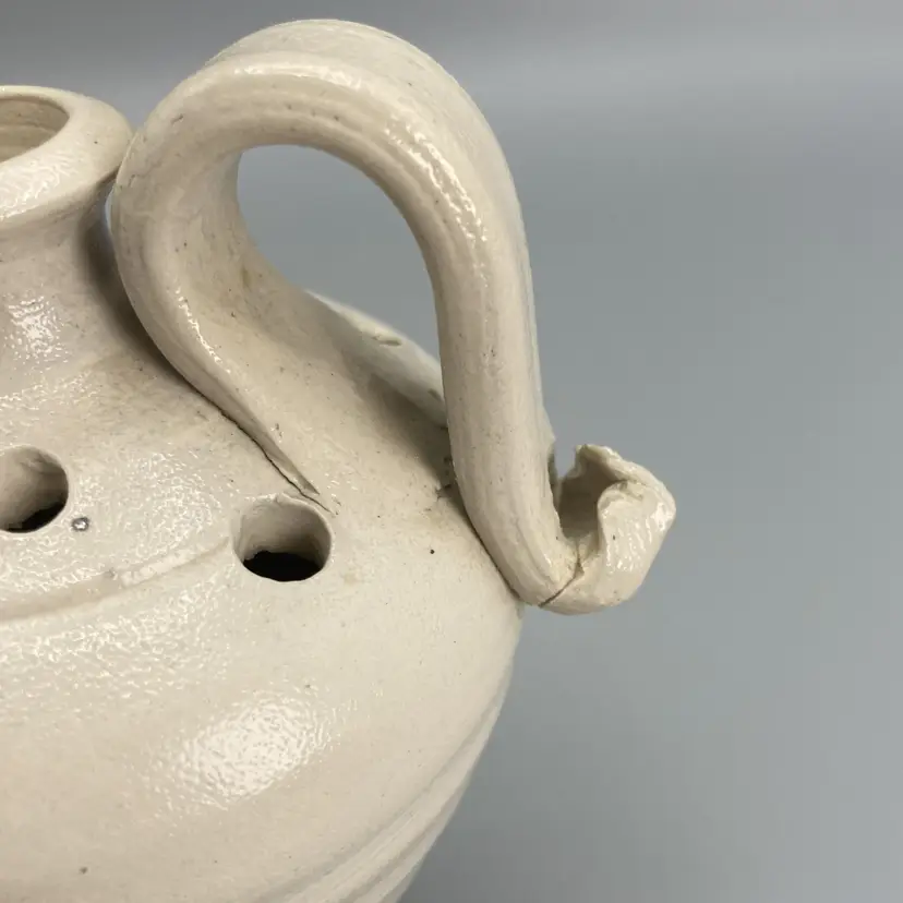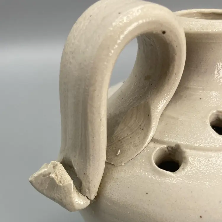 This vase is in good condition overall, however there is a repair to the very tip of the handle. There is also a chip on one side of the very tip of the handle. This vase measures approximately 4 1/2" tall x 3 1/4" wide.