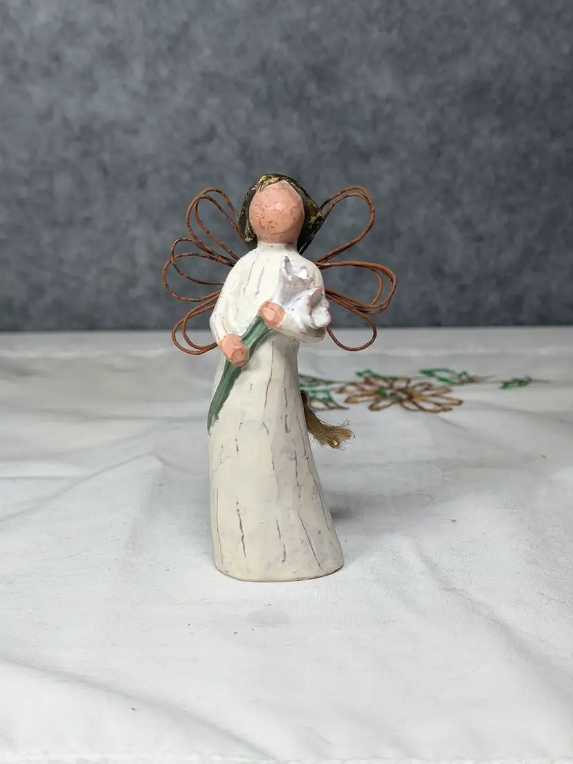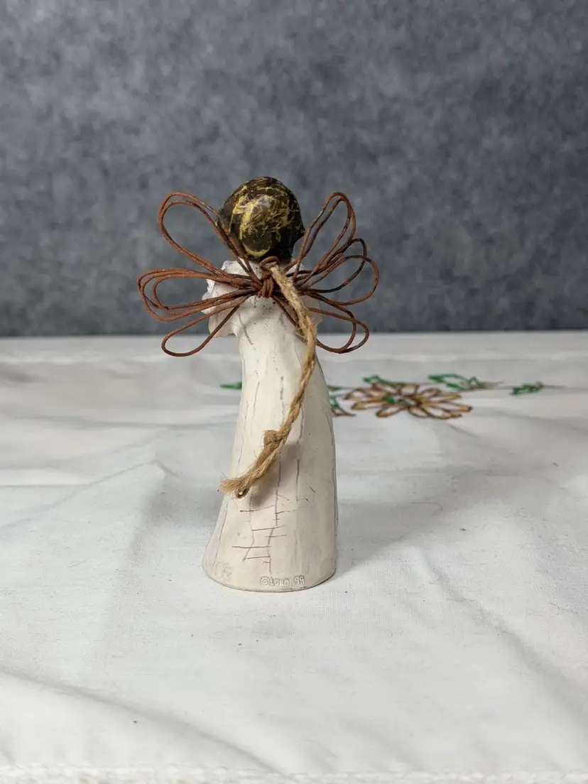 Details: • Authentic Willow Tree design by Susan Lordi • Resin figure with signature carved, faceless style • Wire wings and twine hanging loop • Soft cream gown with hand-finished texture • Approx: ideal ornament/small display size
