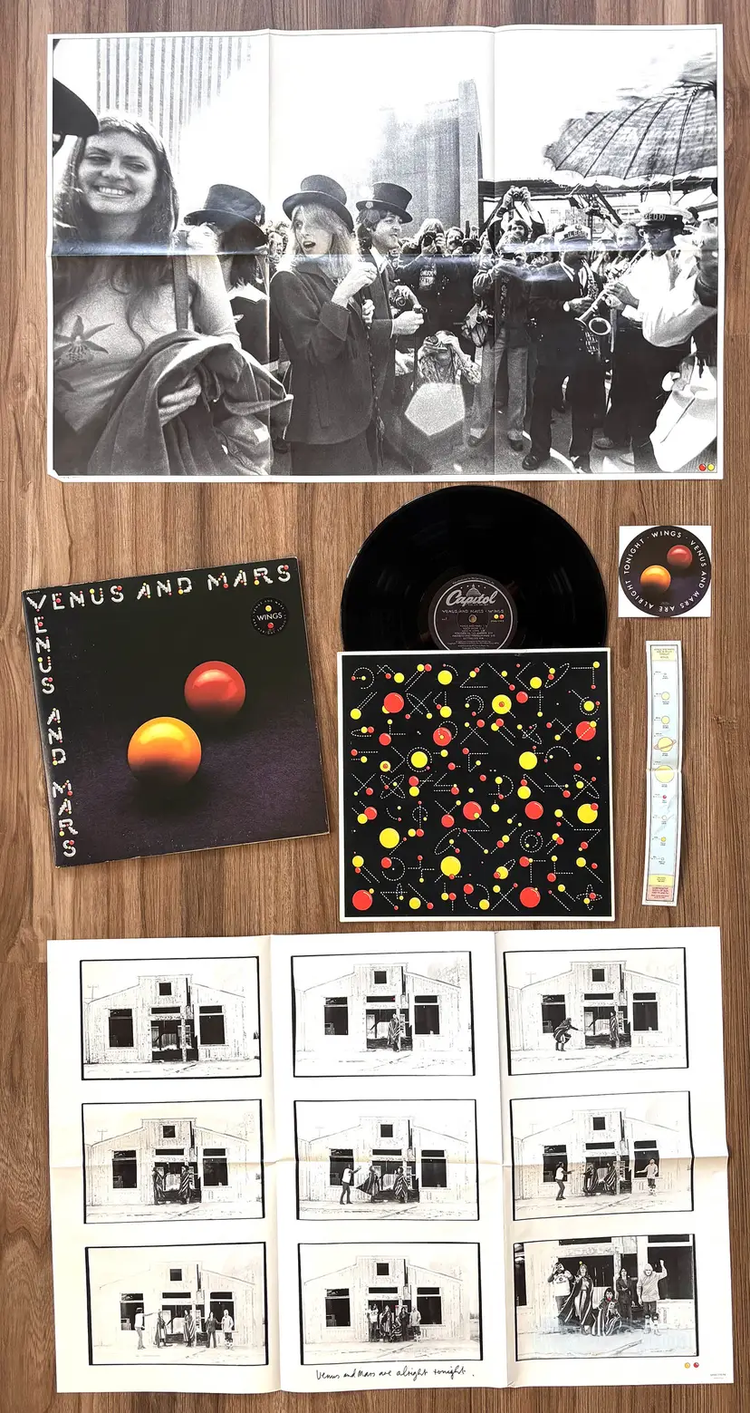 Venus and Mars is the fourth album by Wings. Released as the follow-up to the enormously successful Band on the Run, Venus and Mars continued Wings' string of success and would prove a springboard for a year-long worldwide tour. It was Paul McCartney's first post-Beatles album to be released on the Parlophone label in the UK, and on Capitol in the US. Preceded by the single Listen to What the Man Said, the album appeared two weeks later to decent reviews and brisk sales. The album reached #1 in the US, UK and other countries around the world. Two additional singles, Letting Go and Venus and Mars/Rock Show, were released. Although the latter almost reached the US top 20, it did not chart in the UK. The cover was photographed by Linda McCartney.