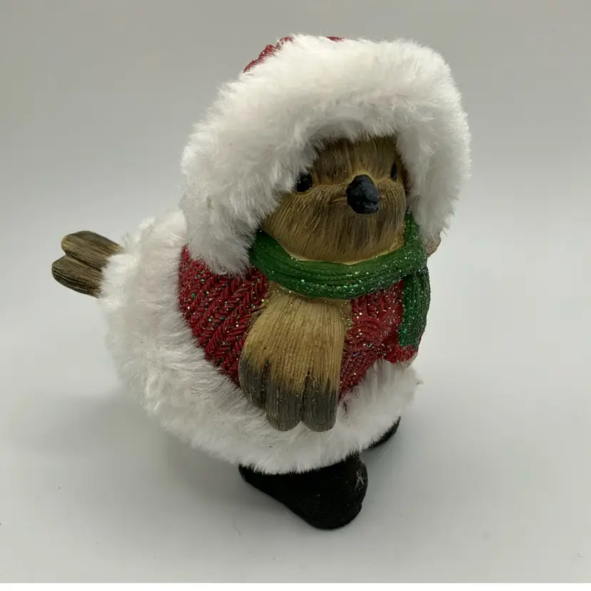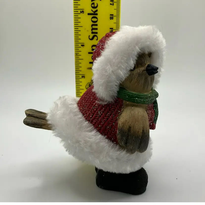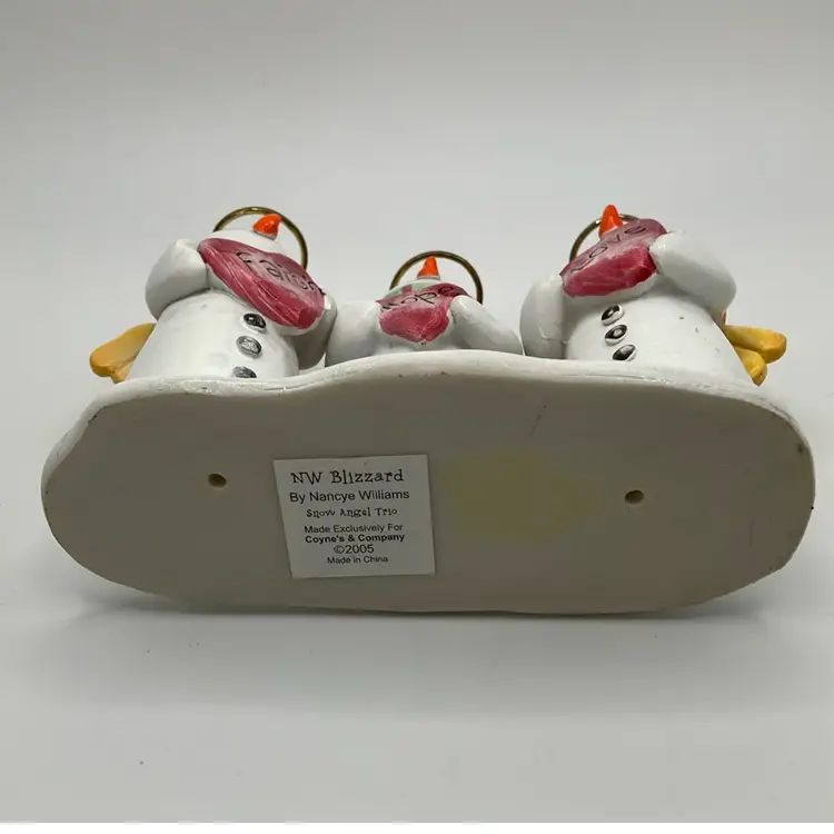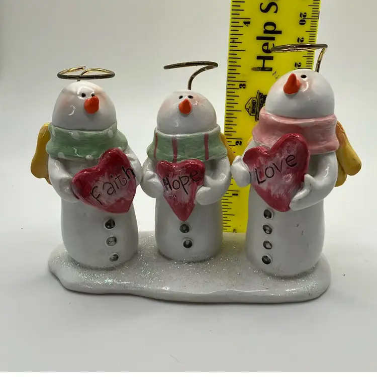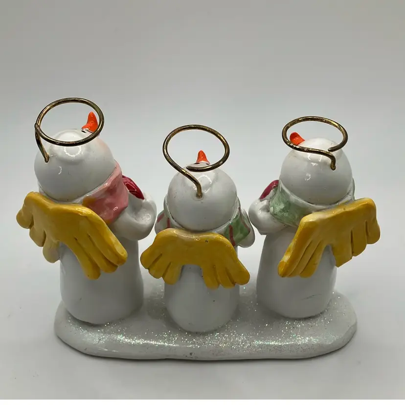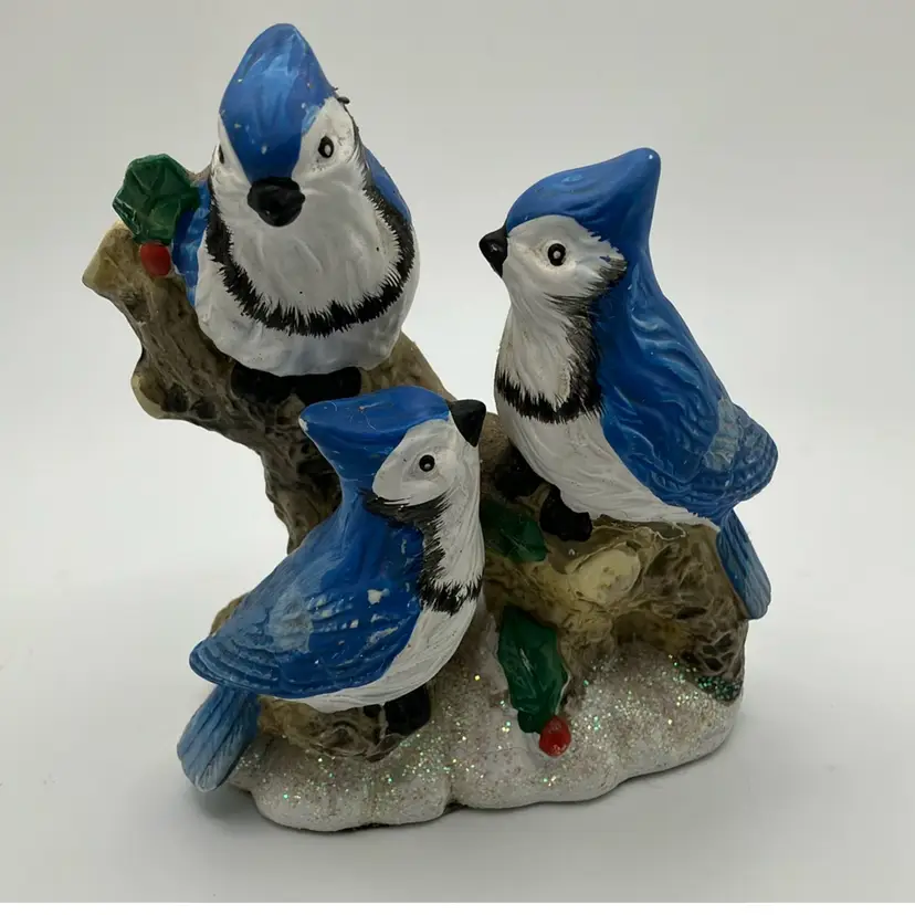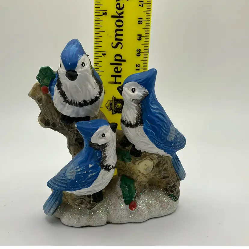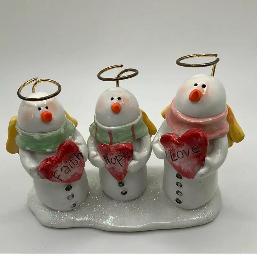 Lot includes 3 figurines: ** Ceramic blue jays on branch trio (some paint wear) ** Faith Love Hope Snowmen angels trio ** Adorable bird in fuzzy hat&coat