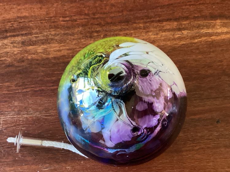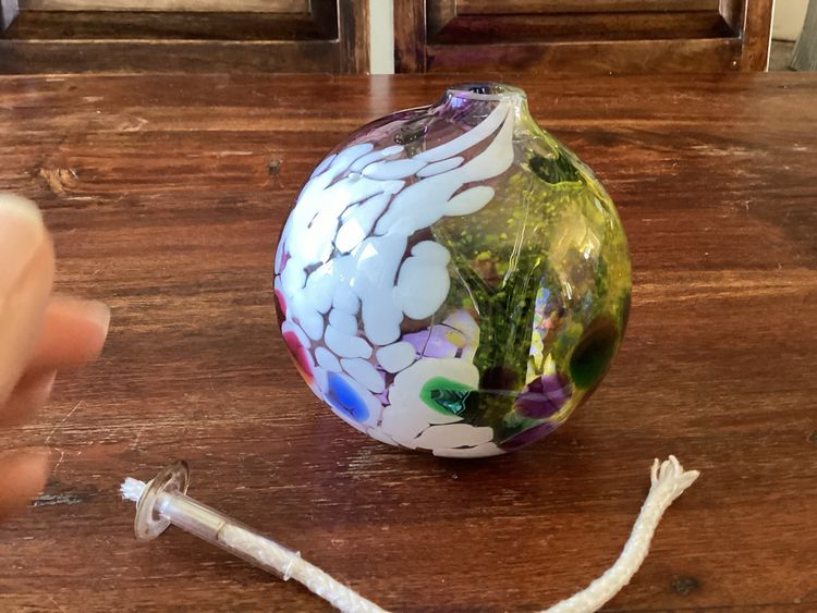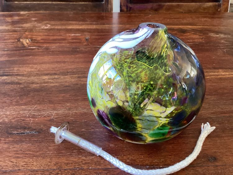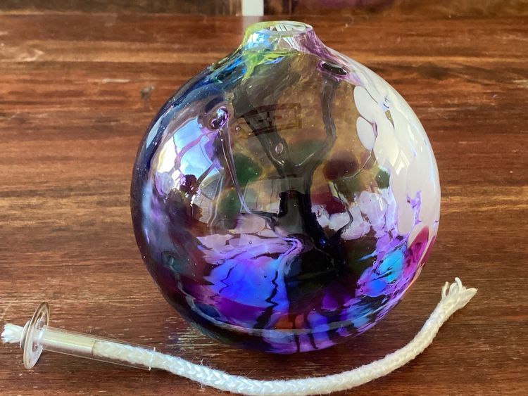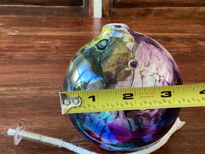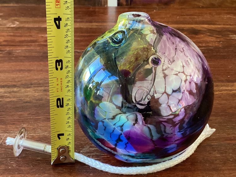This witches ball oil lamp stands 4 inches tall and is 4 inches across the center. It is hand blown, and on the inside it features the pulled threads that look like a tree. The colors range from yellow, blue, green, purple and magenta with a white swirl. The wick is included. No condition issues noted.
