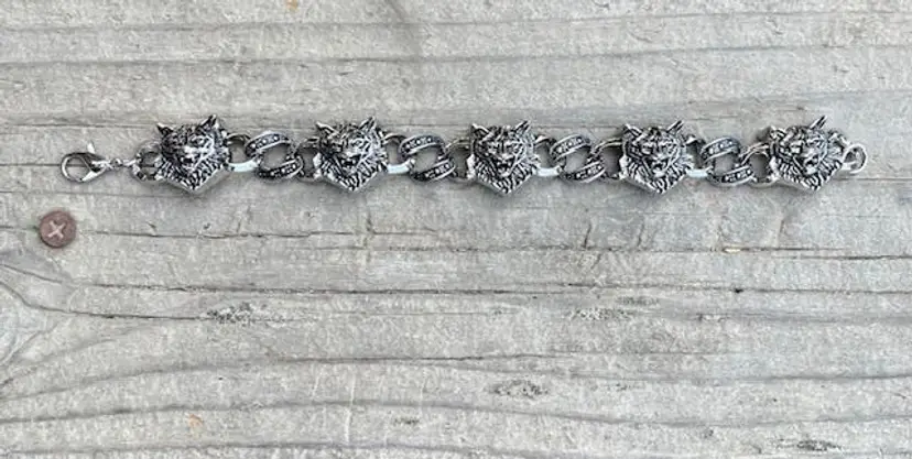 This Bracelet has five Wolf Heads Linked together. 8 inches. Wolf heads are approximately 3/4 inches tall and wide. For a man or woman. WOLF SYMBOLISM: Loyalty, family, and friendship. They embody instinctual power and freedom. In Native American cultures, wolves are revered as teachers and pathfinders.