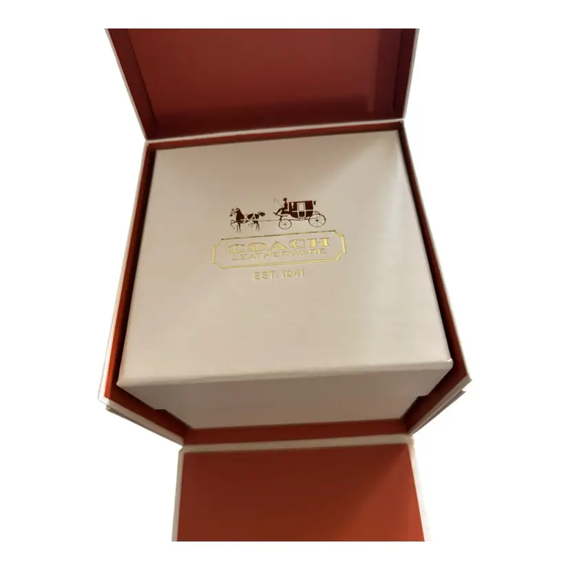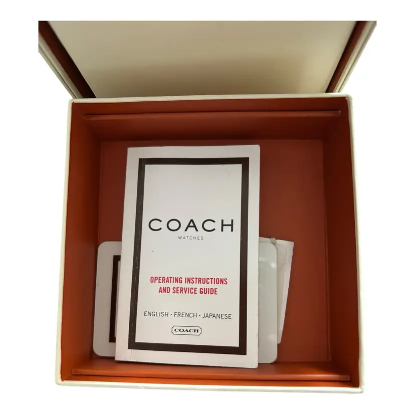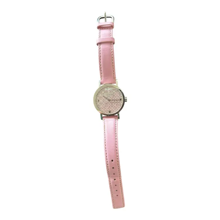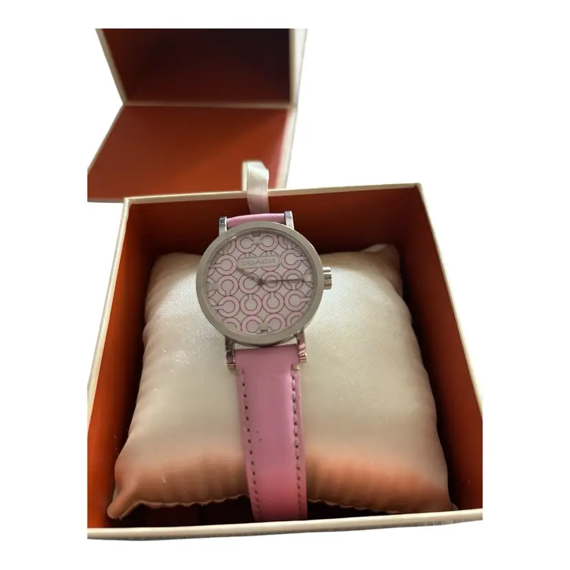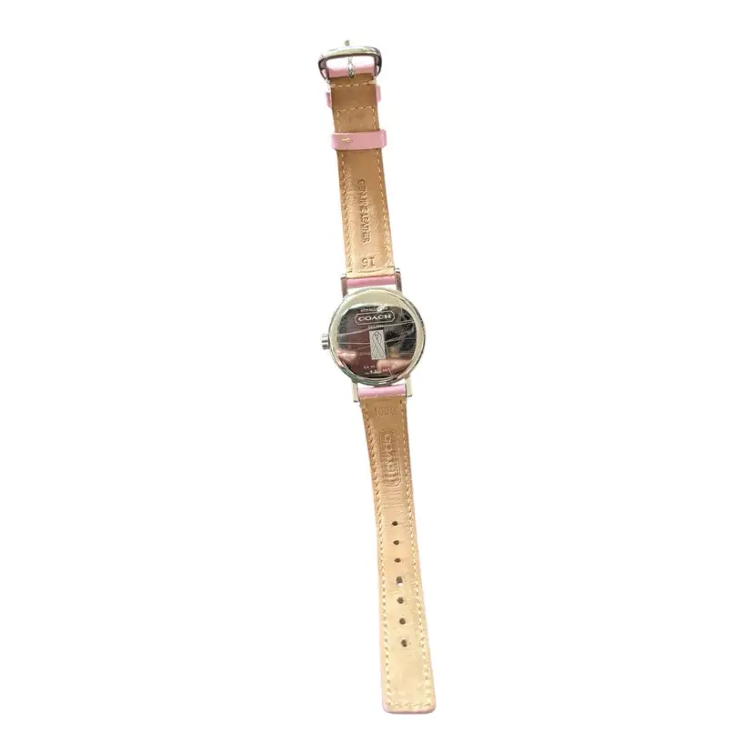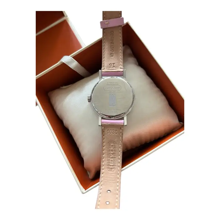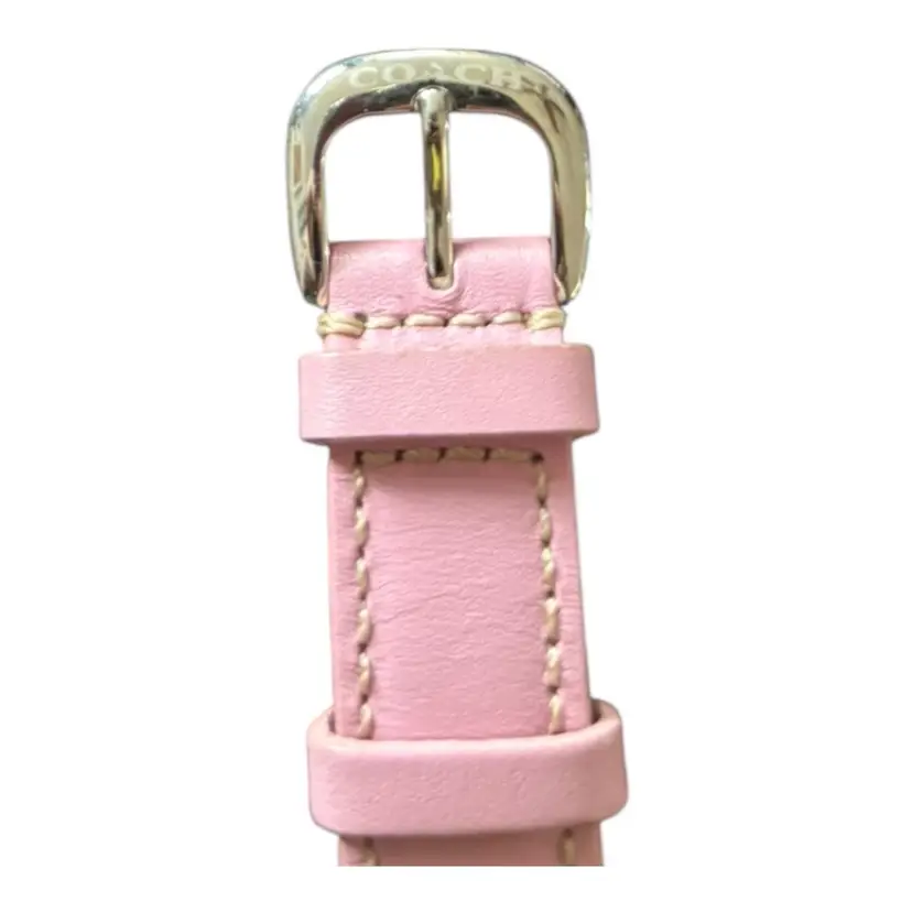 Pink Coach Watch in fabulous condition. Genuine leather strap. Works. Has new battery.