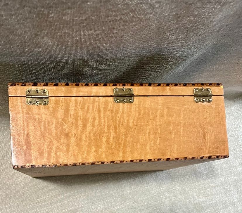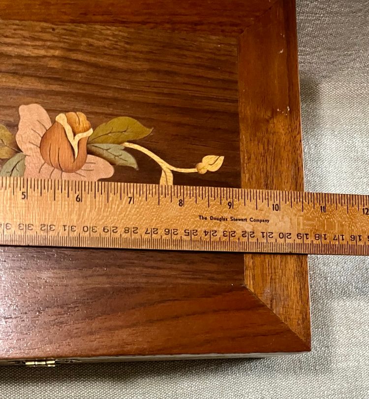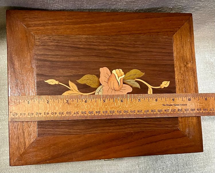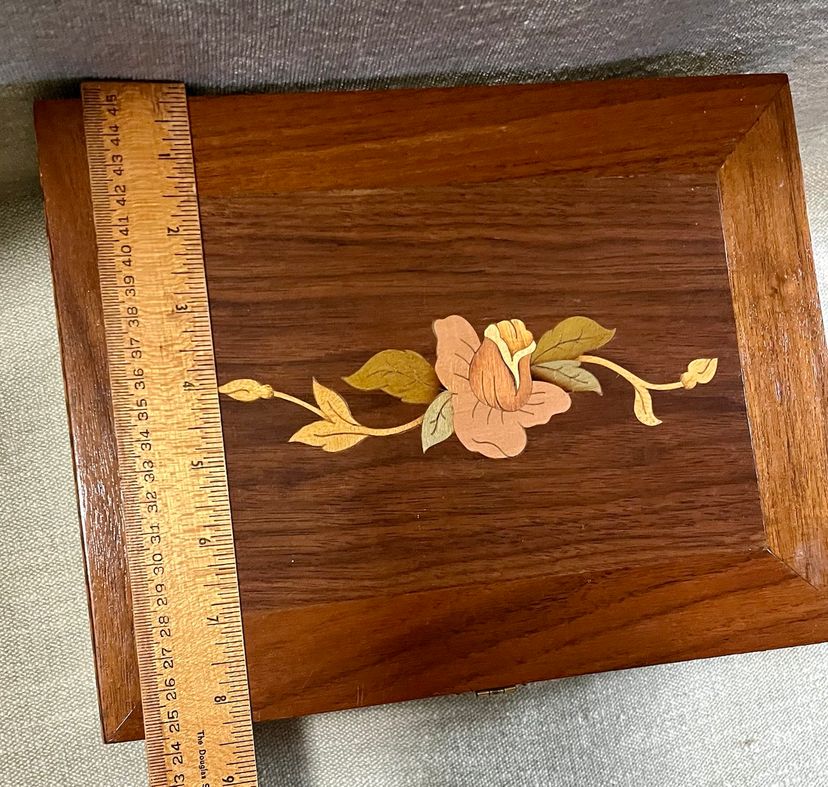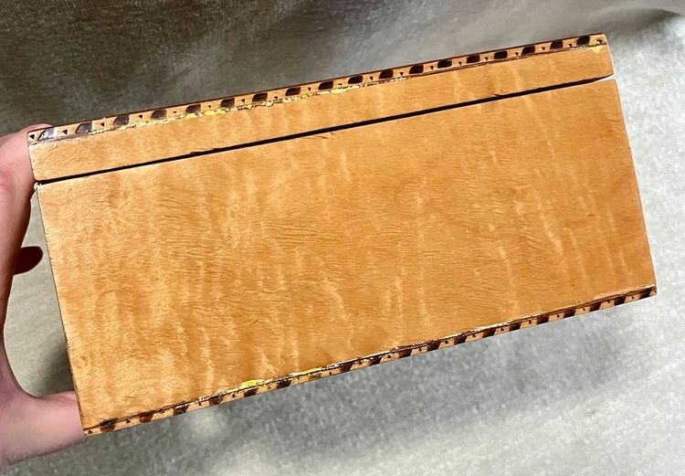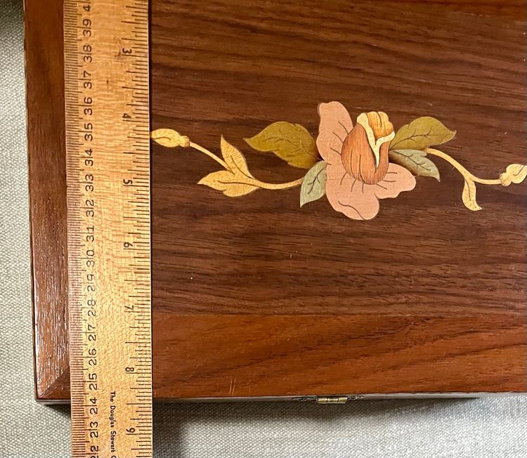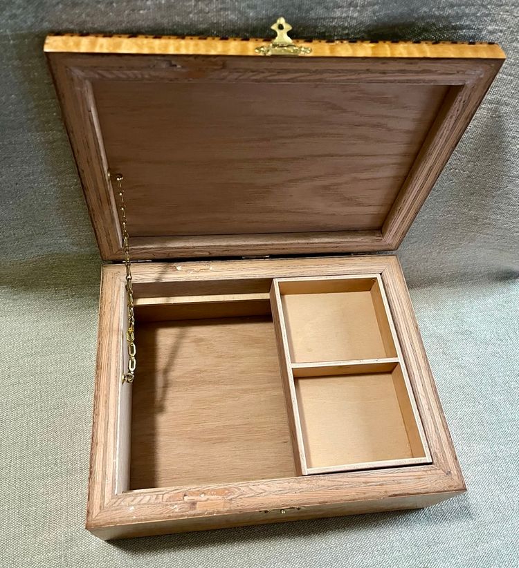 This handcrafted inlay lacquer jewelry trinket box is a beautiful and unique piece crafted in Michigan, USA. The box features a traditional rectangular shape with a medium size, making it suitable for storing jewelry or small items. The interior includes a sliding upper shelf for organization, and the exterior showcases intricate floral and two-tone checkered edging artisanal designs. Made of wood with a lacquered finish, this one-of-a-kind piece is a perfect addition to any room and is easy to care for. The box is adorned with a latch closure and the artist's information on the underside in pencil.