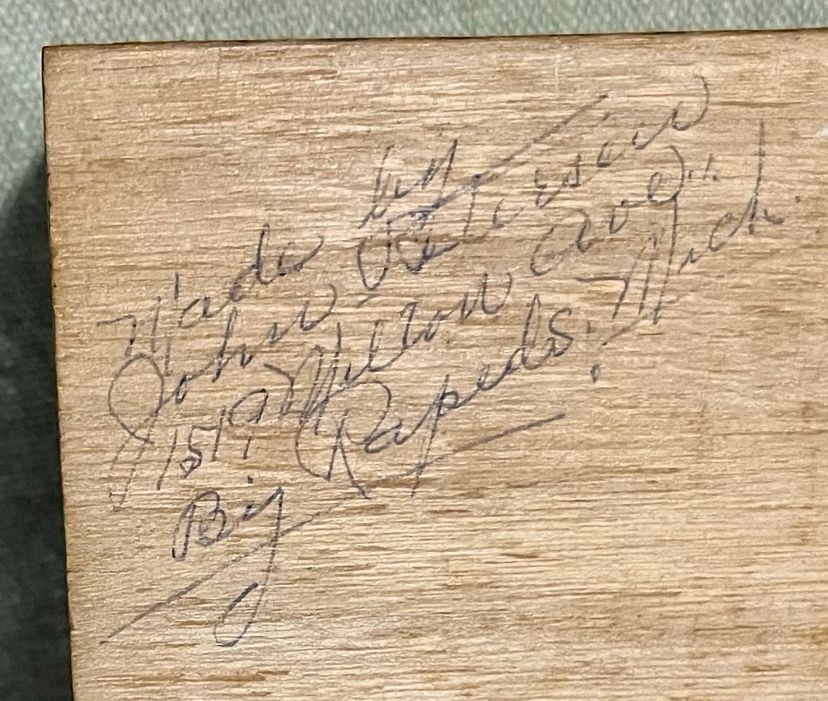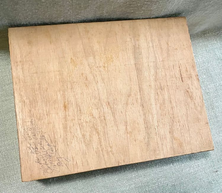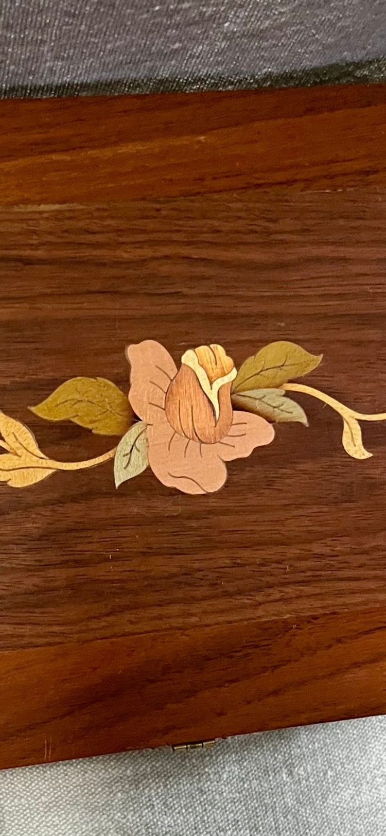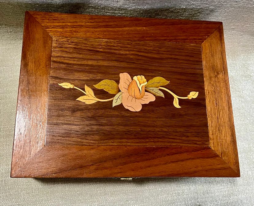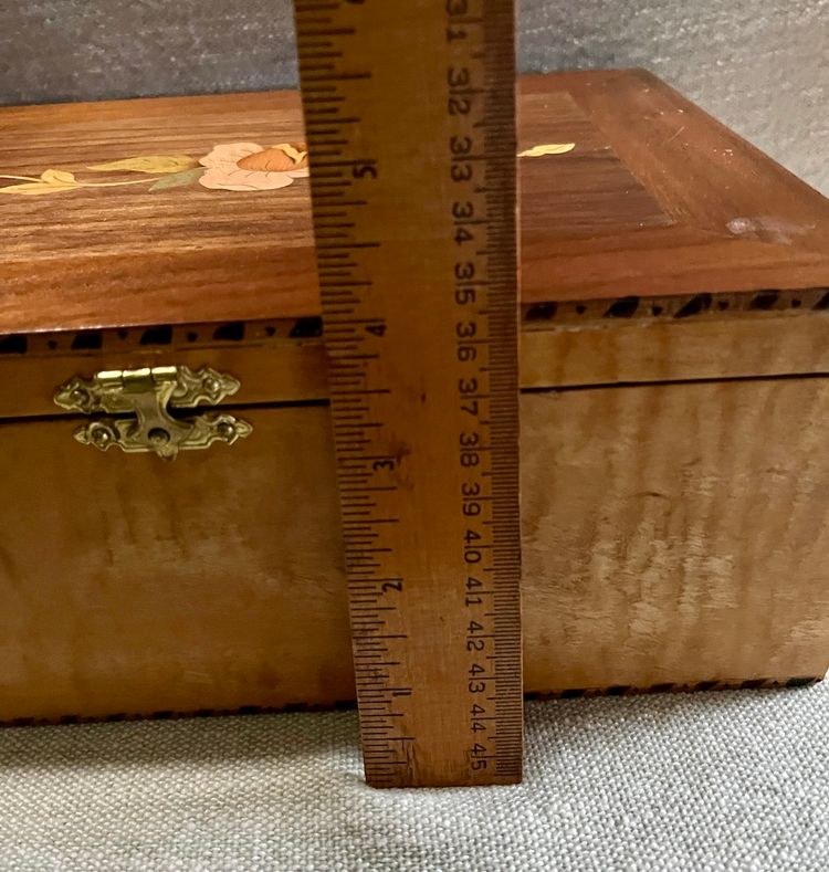 This handcrafted inlay lacquer jewelry trinket box is a beautiful and unique piece crafted in Michigan, USA. The box features a traditional rectangular shape with a medium size, making it suitable for storing jewelry or small items. The interior includes a sliding upper shelf for organization, and the exterior showcases intricate floral and two-tone checkered edging artisanal designs. Made of wood with a lacquered finish, this one-of-a-kind piece is a perfect addition to any room and is easy to care for. The box is adorned with a latch closure and the artist's information on the underside in pencil.