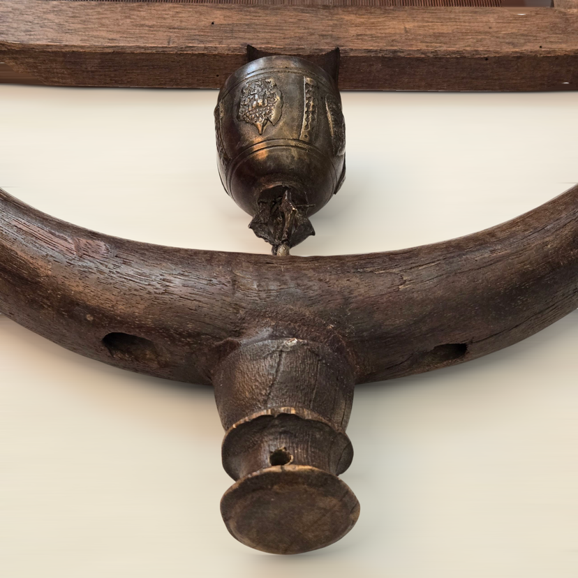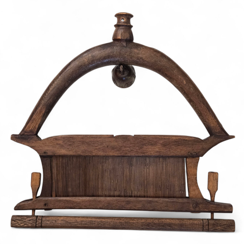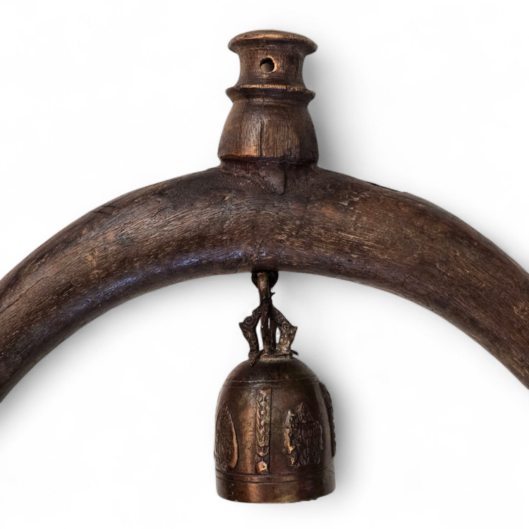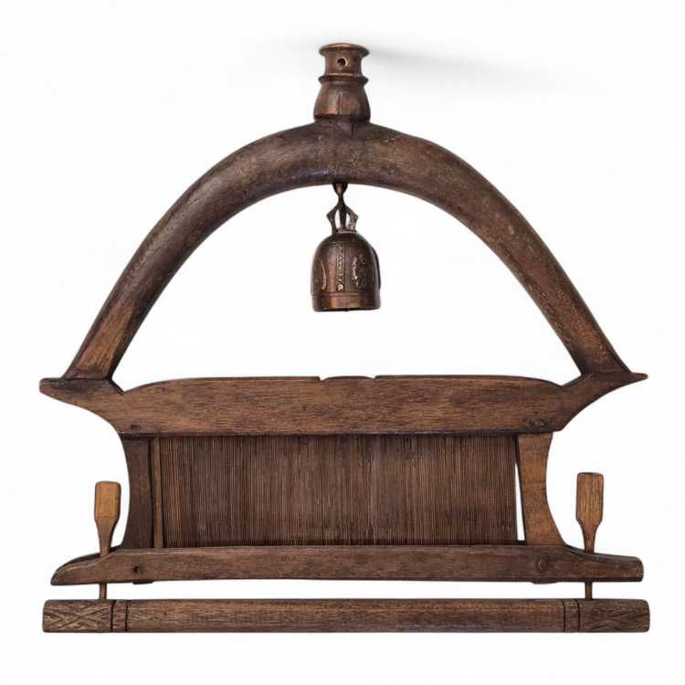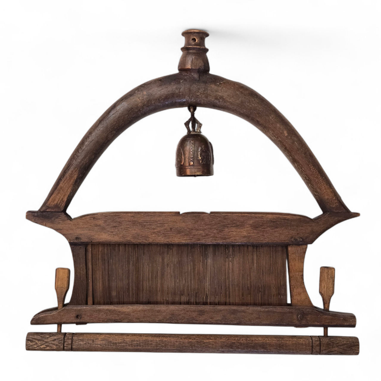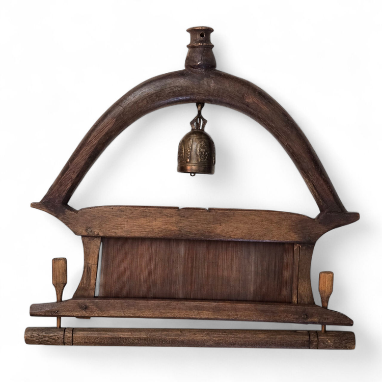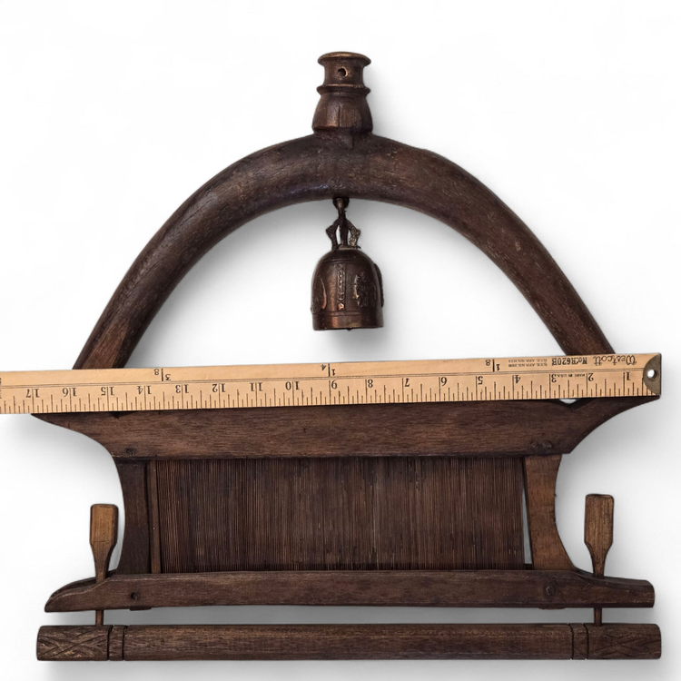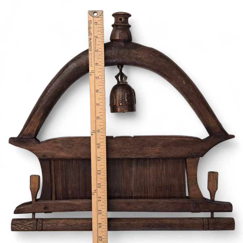 Wood Tapestry Hanger Handmade Metal Brass Bell from Thailand with Condition Issues Unbranded. Used condition with some cracks in the wood, nails holding some parts together (normally no nails), string and wire holding cast bell to frame, scratches, nicks, etc. from actual use. Please view all the photos and please ask any questions prior to purchase when possible.