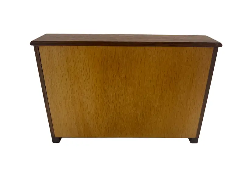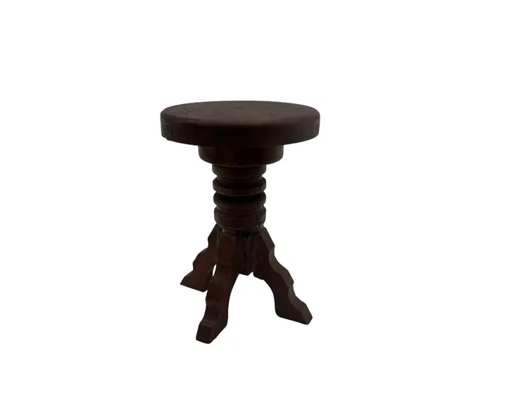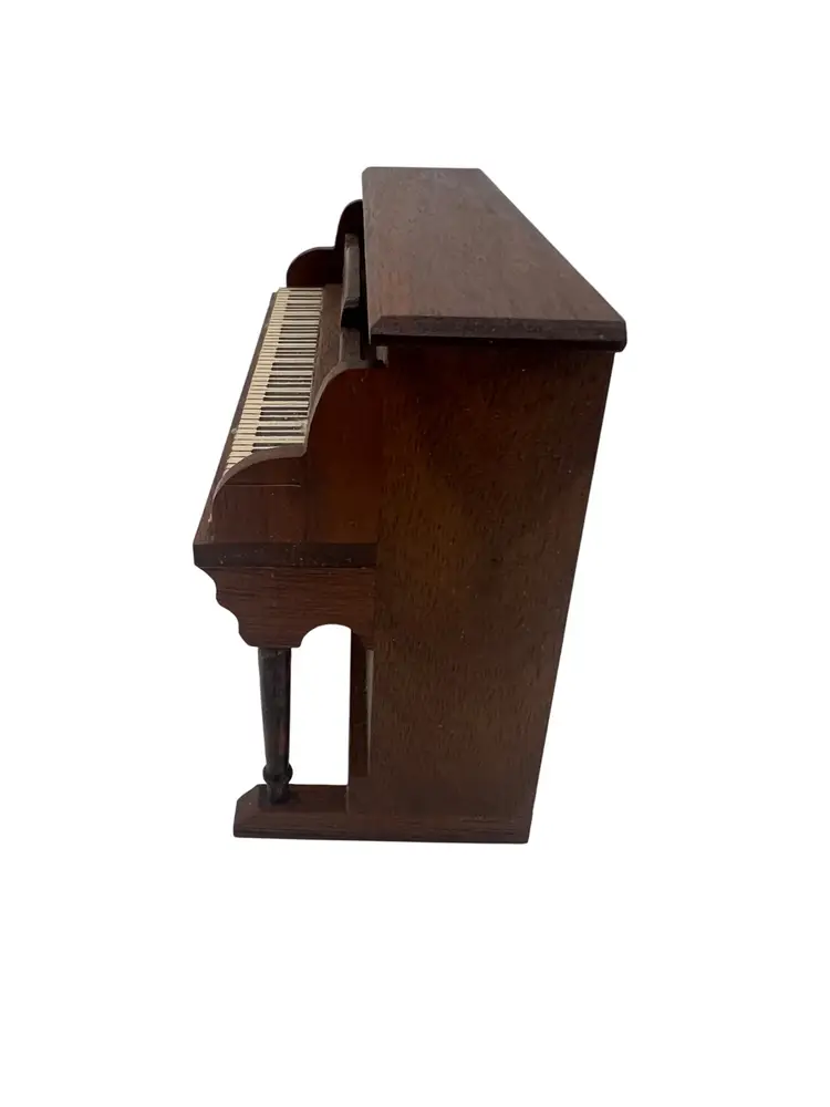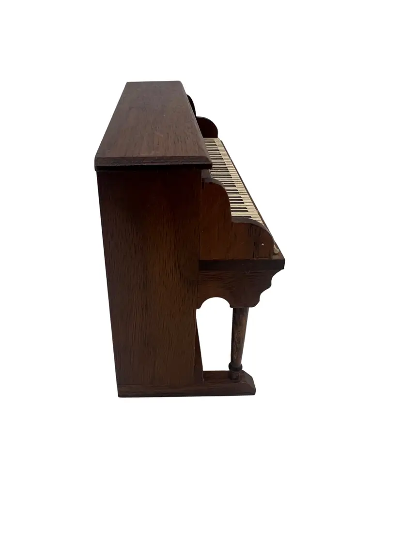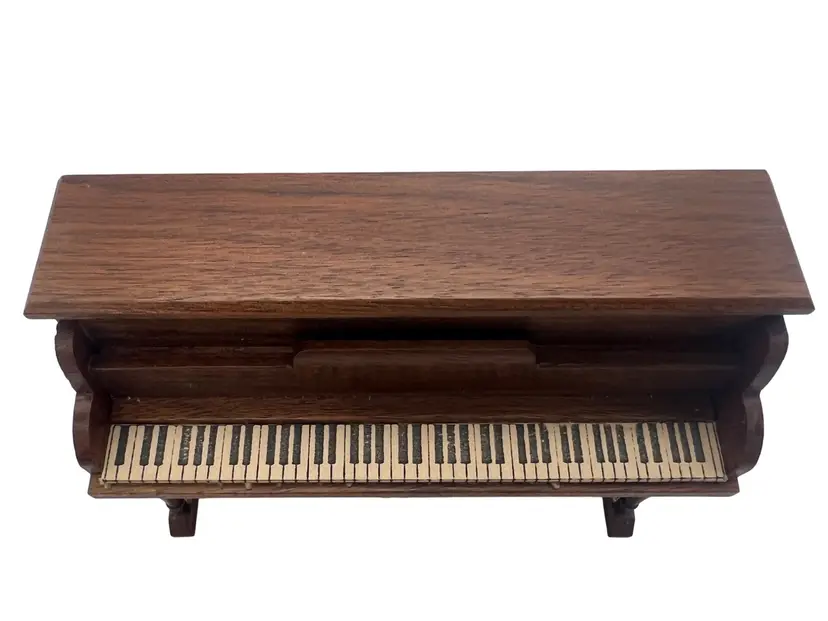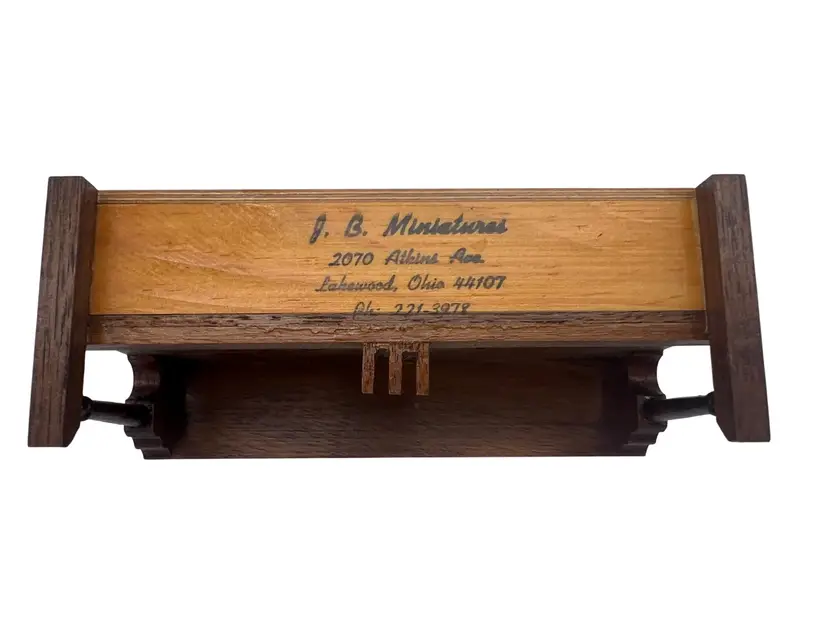 Vintage 1:12 scale upright piano and stool by J. B. Miniatures (Lakewood, OH). Solid wood with carved leaf motif, printed key strip, and triple pedals; matching turned 4-leg stool included. Measures about 5" x 2" x 3.5"; stool ~1.75" H. Great addition to a dollhouse music room or artisan miniature collection.