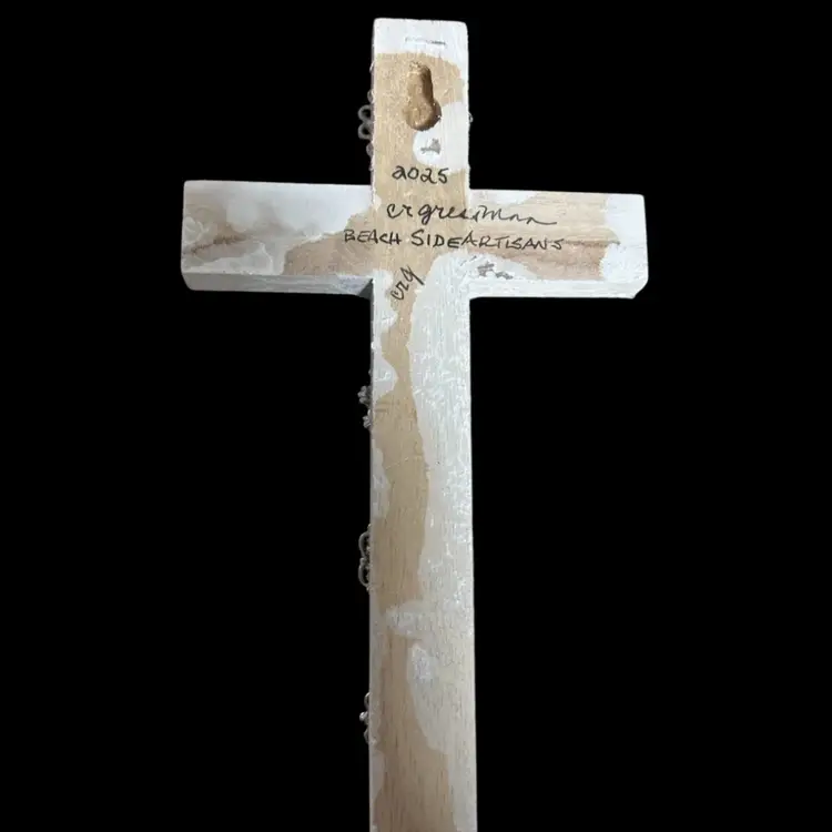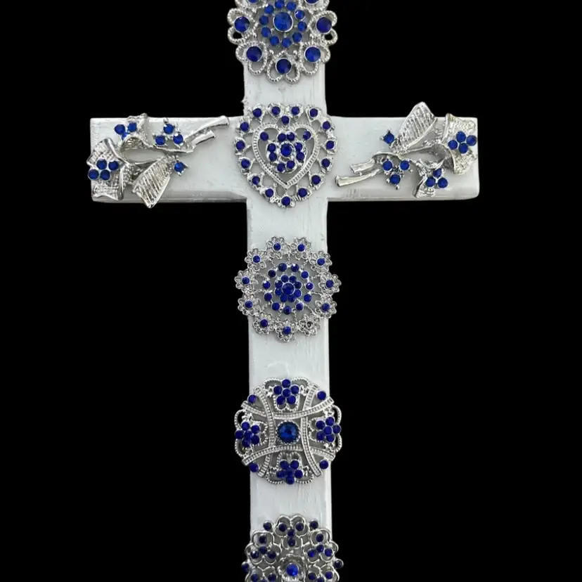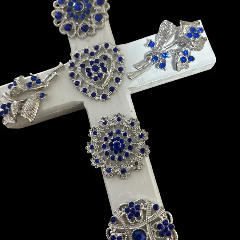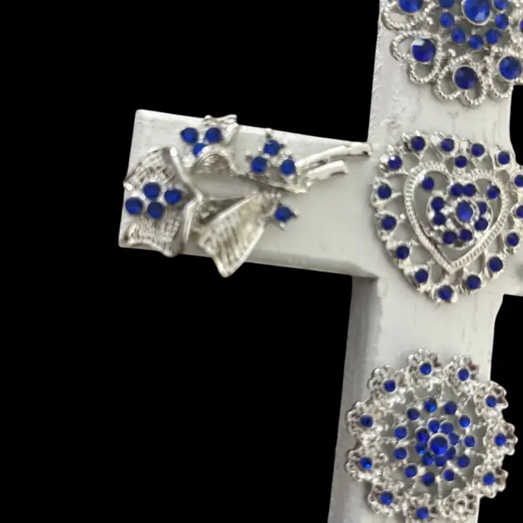 This wooden cross was stained and then I applied brooches. It measures approximately 8” tall and 4 1/2” wide. These are made to order so it may not look exactly like the one in the picture however, the color of the brooches will be the same. Feel free to reach out to me for custom orders because some of the crosses also come stained.