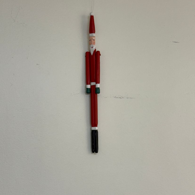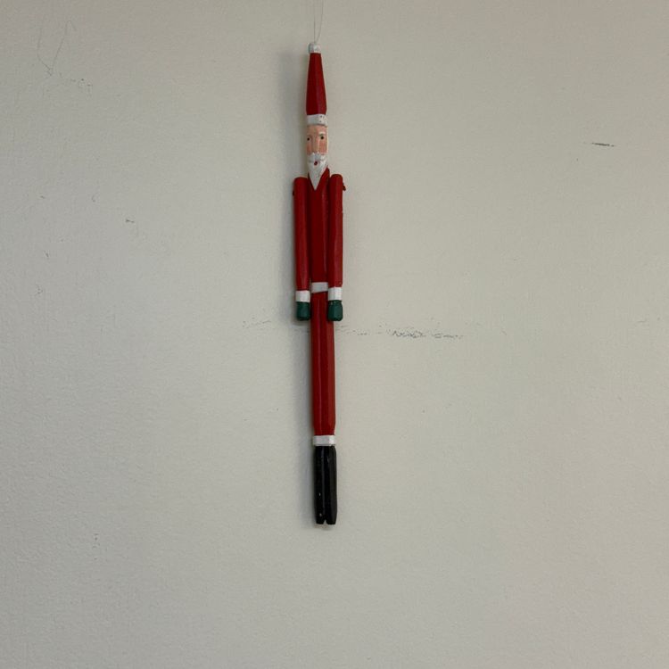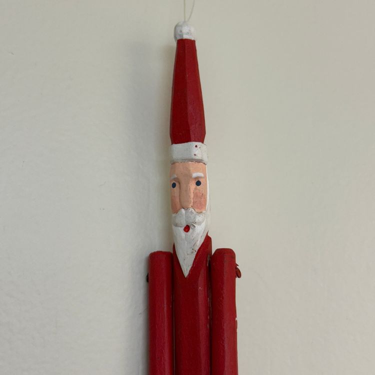 Wooden Handcrafted Santa Claus. Has a loop at the top for hanging on a Christmas Tree. Classic design of Santa Claus with arms that move. Has a red coat and pants with white beard. 10" Long