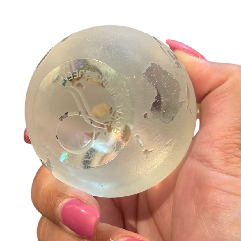 This is an amazing piece! Part frosted part clear glass. Underneath there is a logo and it says royal Viking queen. 2 1/2 inches.