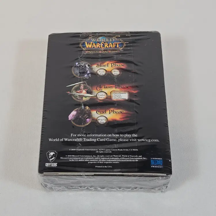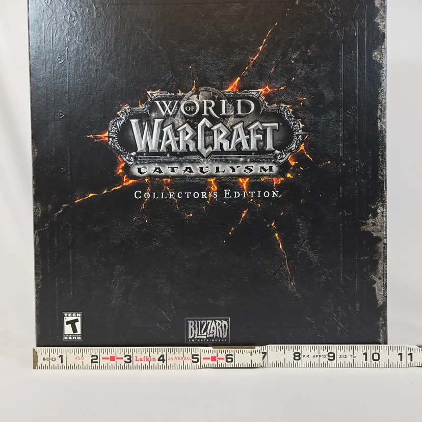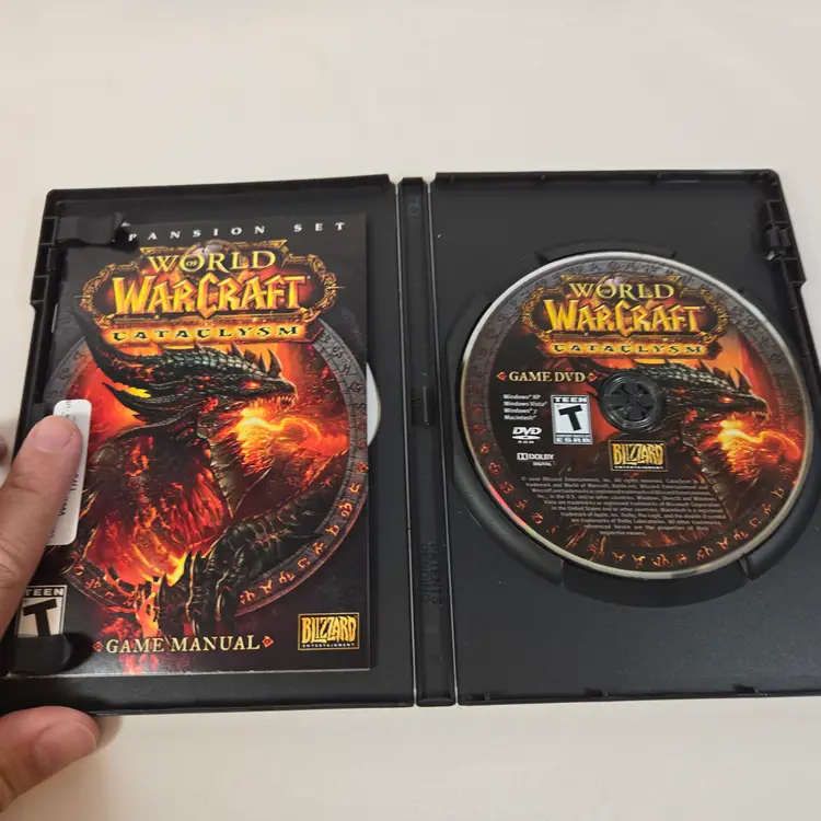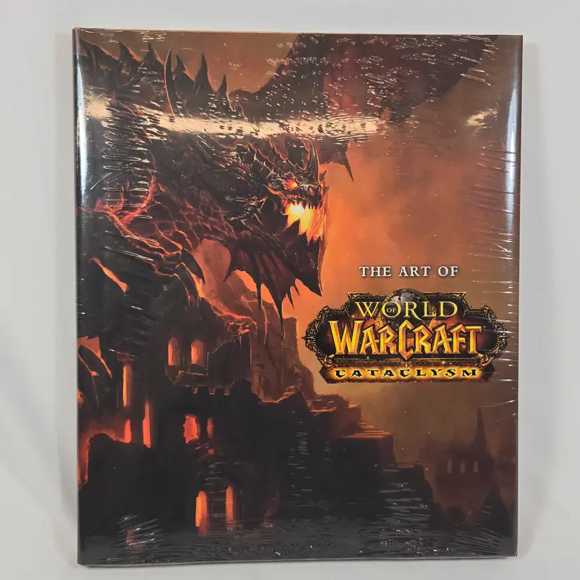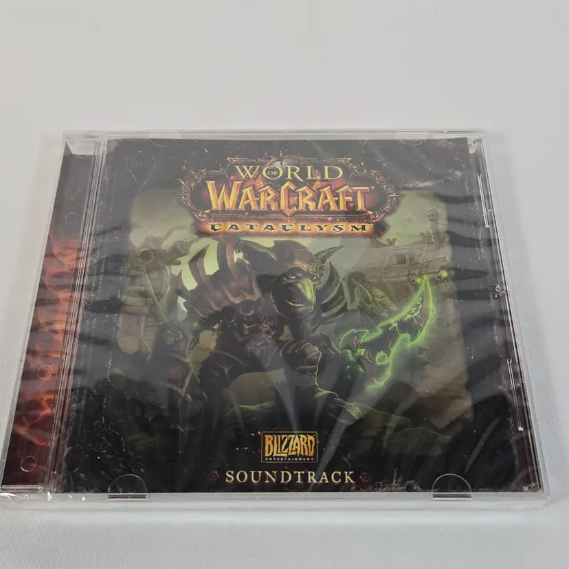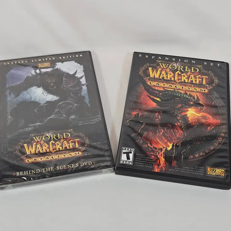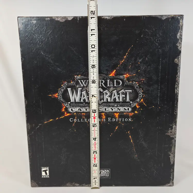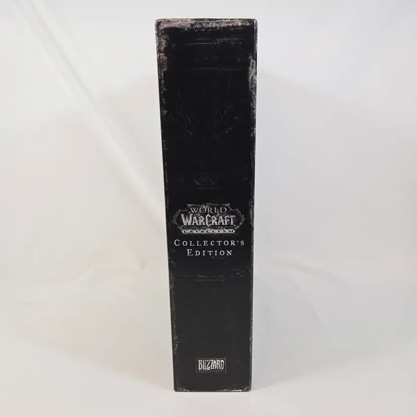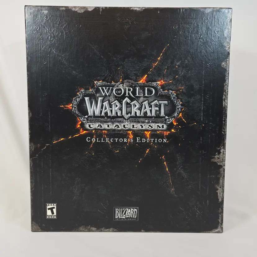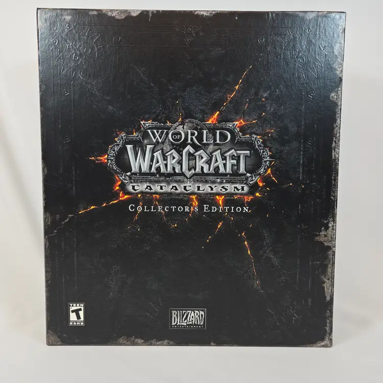 World of Warcraft Cataclysm Collector’s Edition with several sealed components: The Art of World of Warcraft: Cataclysm hardcover book, official soundtrack CD, trading card game starter deck, behind-the-scenes DVD, and guest passes. Outer box shows shelf wear but remains sturdy. Expansion disc is included but not factory sealed. A great piece for WoW fans and Blizzard collectors looking for a complete Cataclysm set with multiple factory-sealed items.