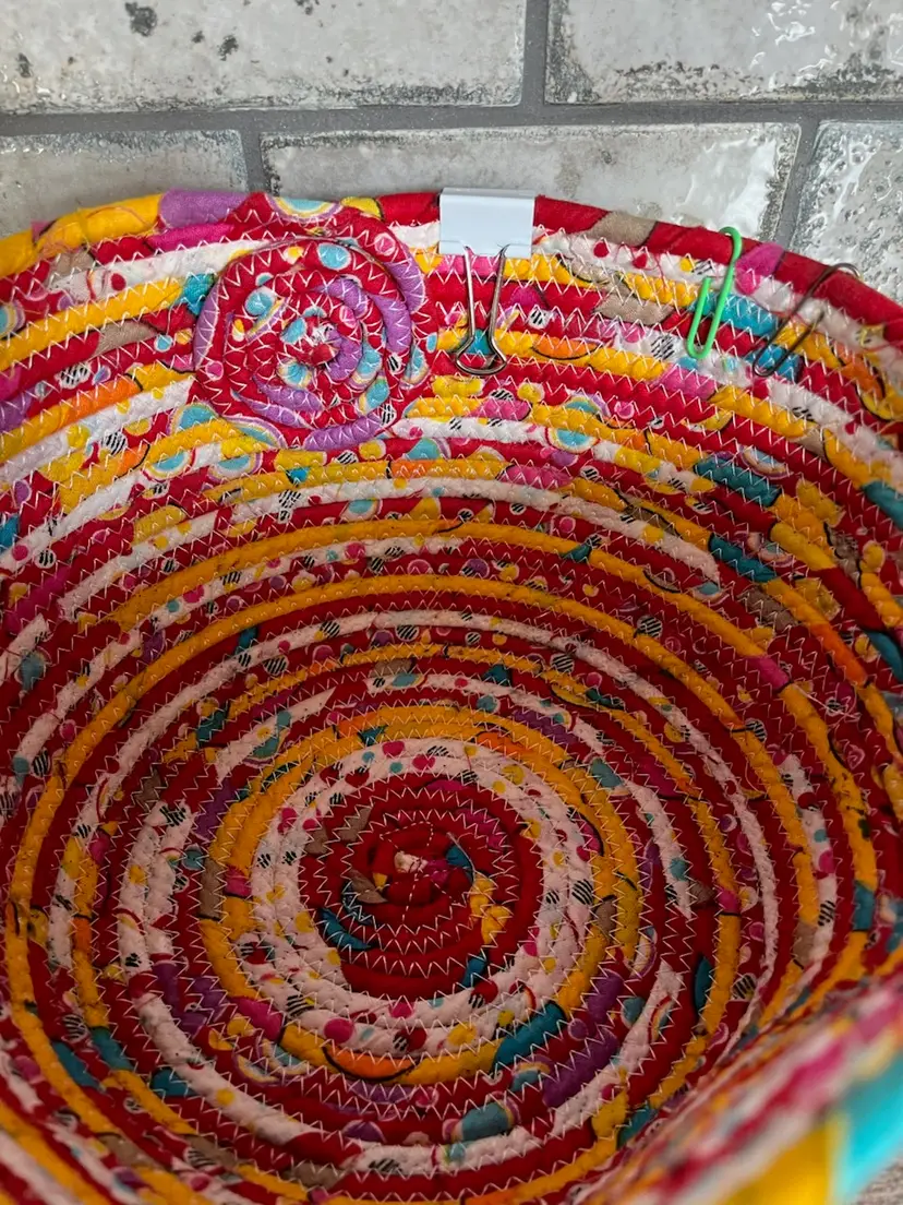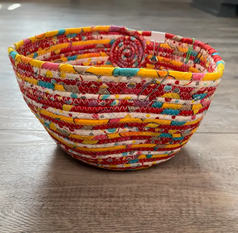 A beautiful bright hand-crafted basket. Pear shaped. Firm shape. 5 inches tall and 8 inches wide. A pretty flower is the end of the basket. A metal clip and paper clip are permanently attached. Pre-owned. Excellent condition. A nice collectible or gift idea.