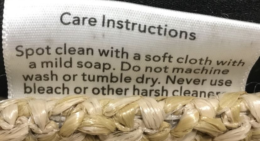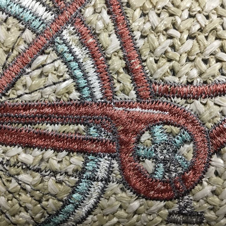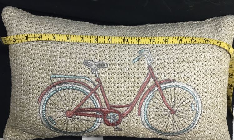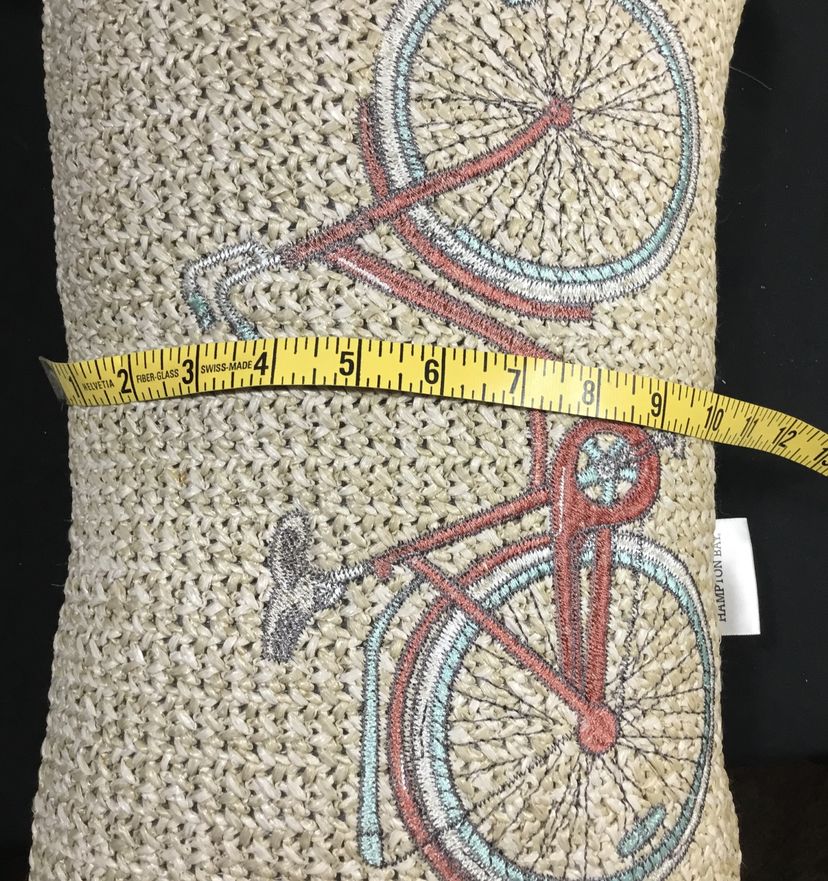 20 inches long by 12 inches wide (from seam to seam) 6 inches thick, woven raffia with old-fashioned, single speed, red bicycle embroidered on the front. Bicycle frame is red with blue and white tires and rear rack.