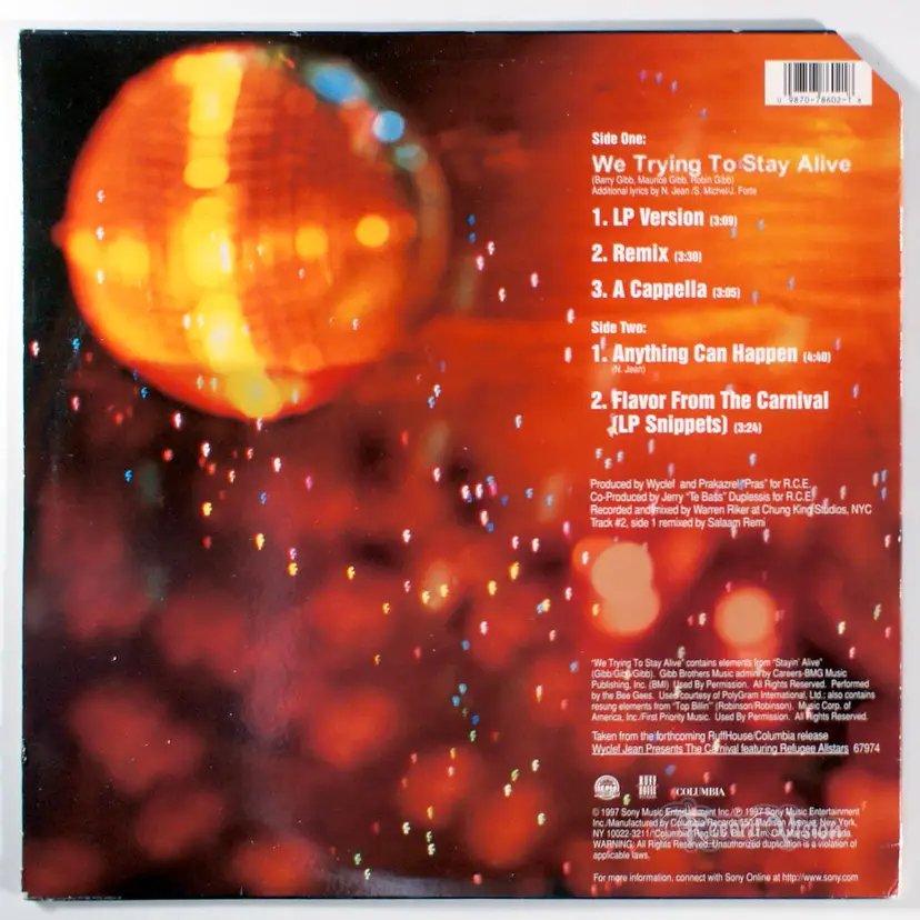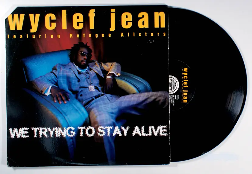 We Trying To Stay Alive (12" Single), by Wyclef Jean, is a vinyl maxi-single featuring various versions of the lead track, including remixes, instrumentals, and a cappella renditions, alongside tracks like Anything Can Happen. A standout feature is its creative sampling of the Bee Gees' disco classic Stayin' Alive, blended with elements from Audio Two's Top Billin' and, in the video version, an interpolation of Kraftwerk's Trans-Europe Express, showcasing Wyclef's innovative fusion of hip-hop with diverse genres. The single marked Wyclef Jean's entry into solo artistry following the massive success of the Fugees, highlighting his transition with contributions from Refugee Camp associates John Forté and Pras. The title track emerged as a fan-favorite for its energetic party vibe and clever lyrical boasts. As a hit single, We Trying to Stay Alive peaked at No. 45 on the Billboard Hot 100, No. 3 on the Hot Rap Songs chart, and No. 14 on the Hot R&B/Hip-Hop Songs chart.