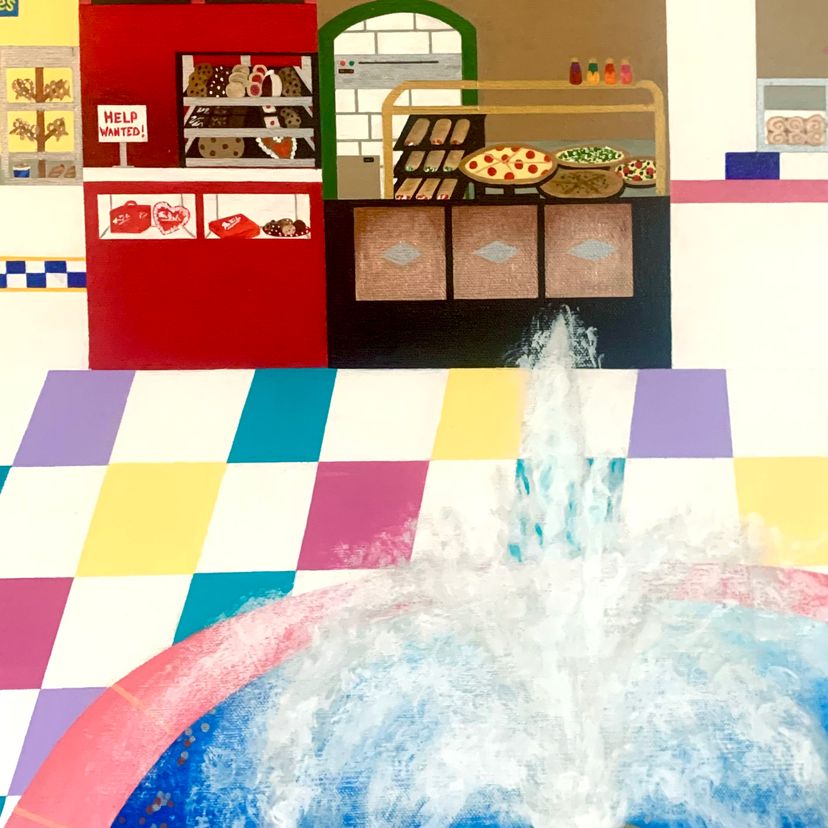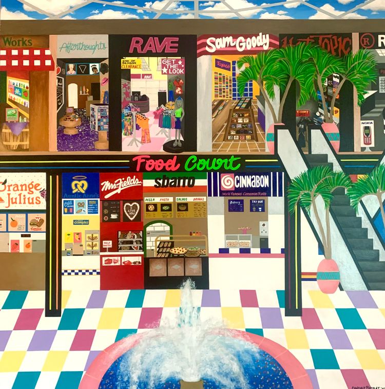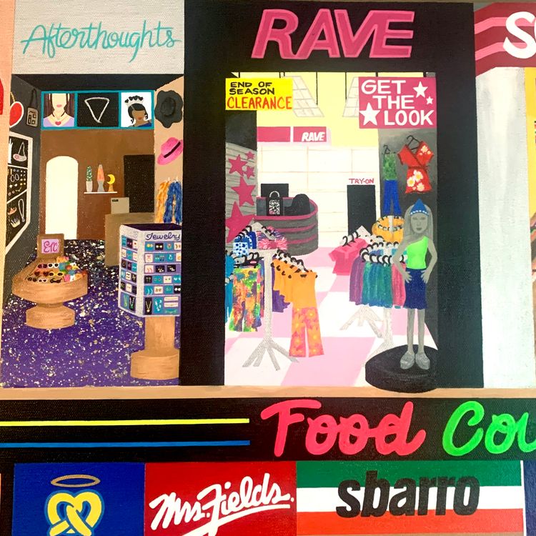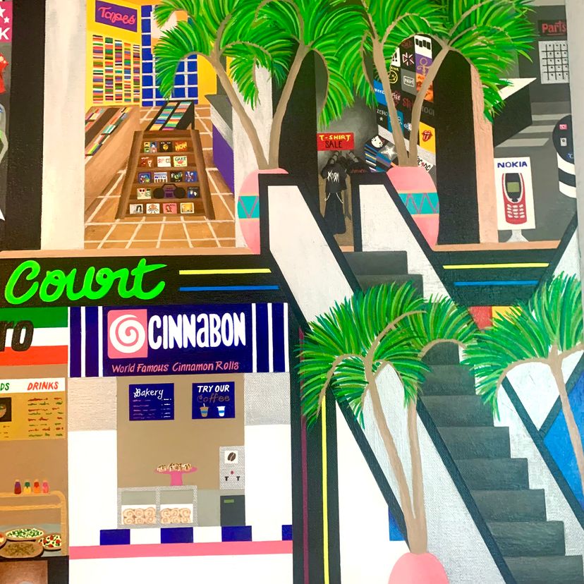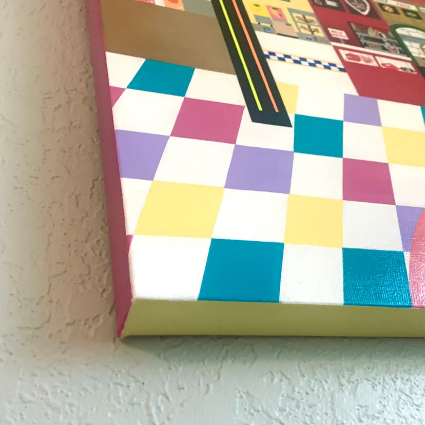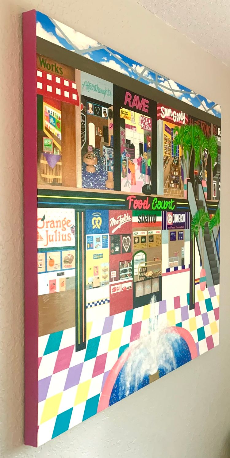 -“Liminal Mall” by Candace Bryant (2025) -Acrylic paint on gallery-wrapped canvas -36x36" / 3 ft x 3 ft - 1” depth -High gloss varnish top coat -Painting is signed on the bottom right -Wire hanger
