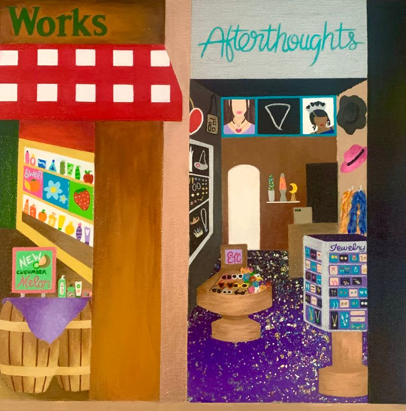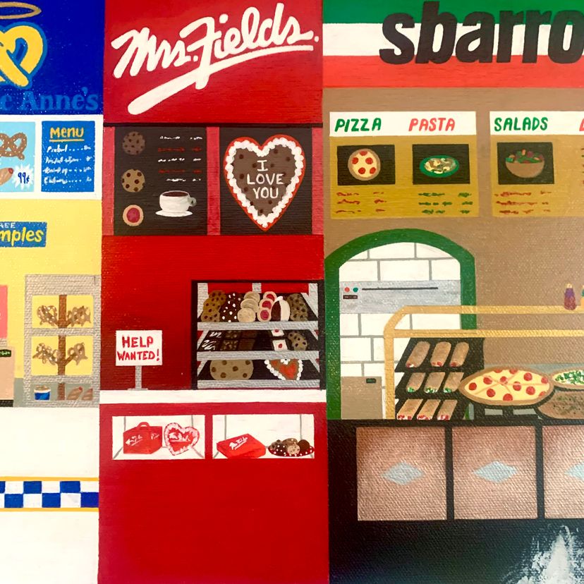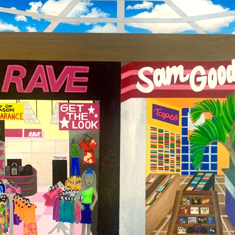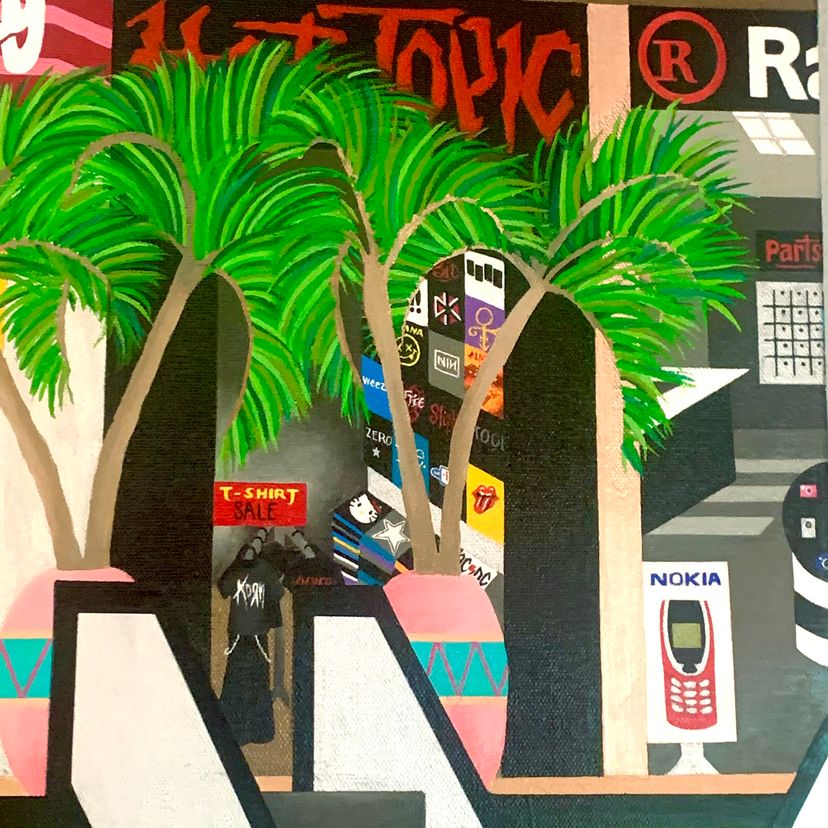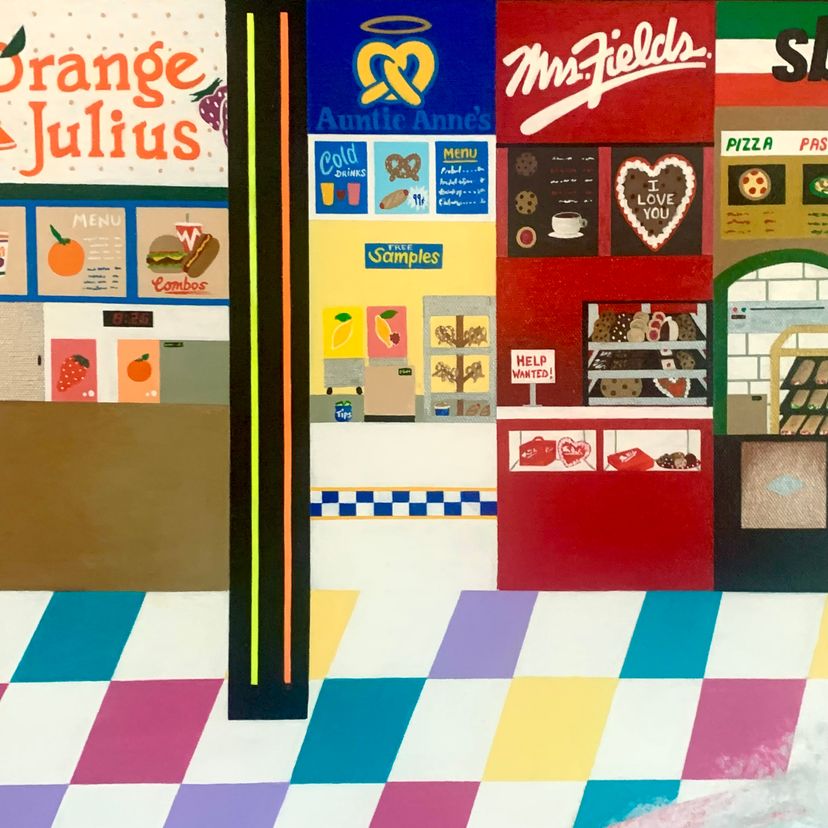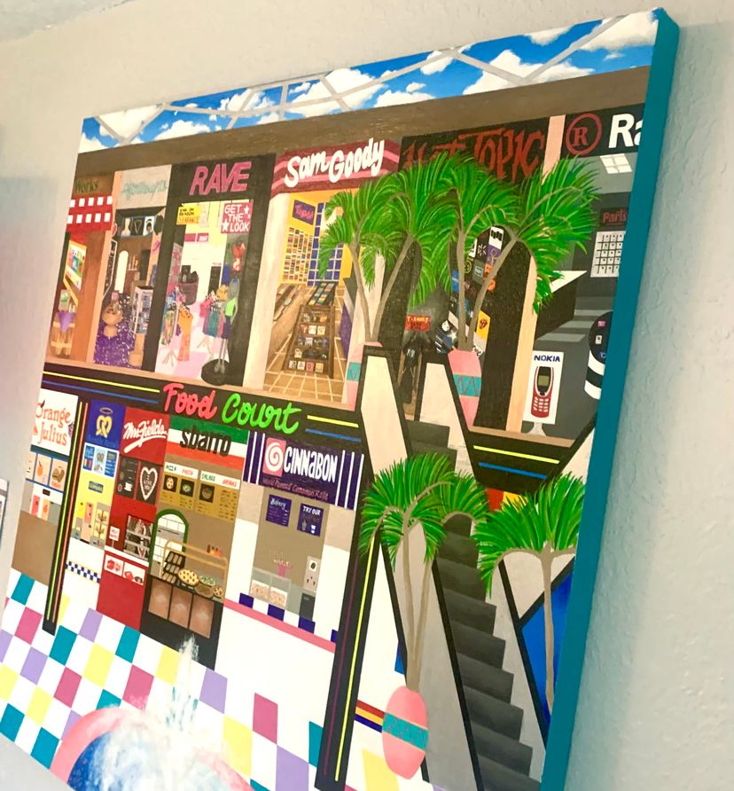 -“Liminal Mall” by Candace Bryant (2025) -Acrylic paint on gallery-wrapped canvas -36x36" / 3 ft x 3 ft - 1” depth -High gloss varnish top coat -Painting is signed on the bottom right -Wire hanger