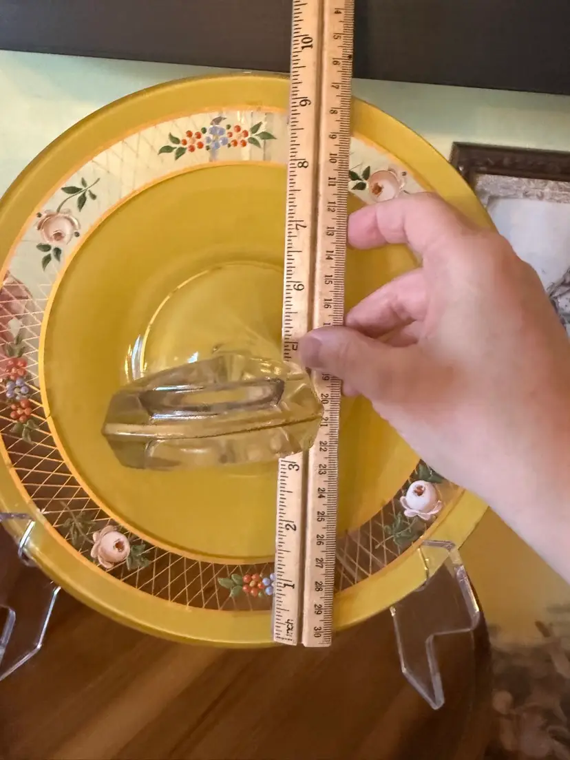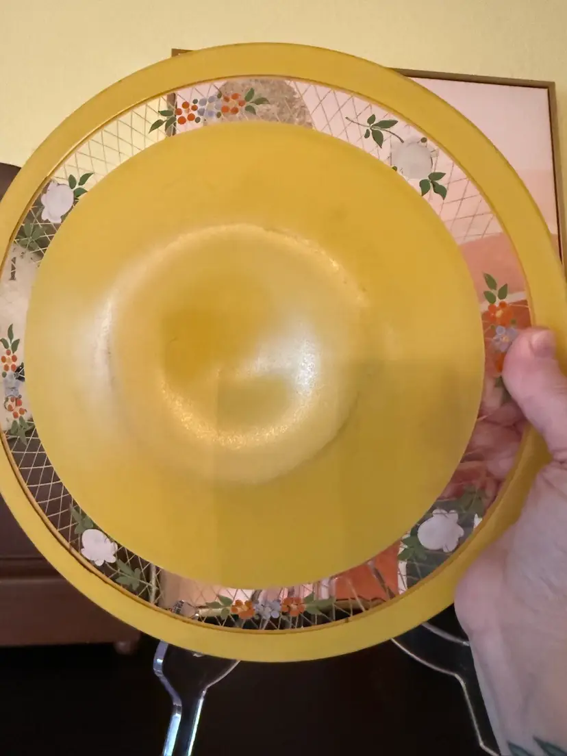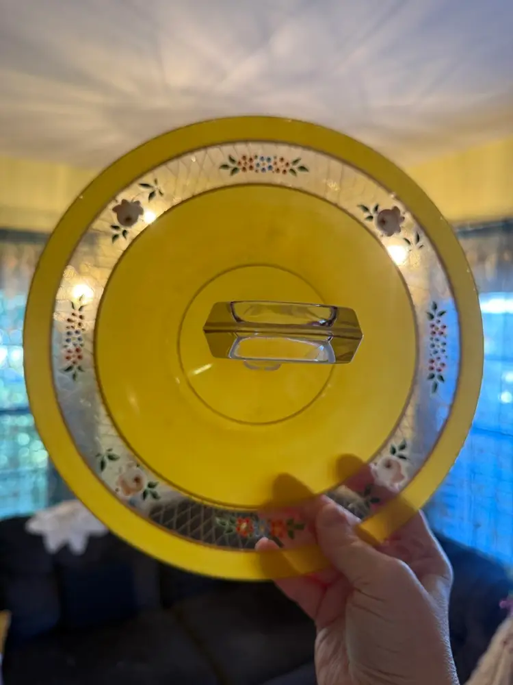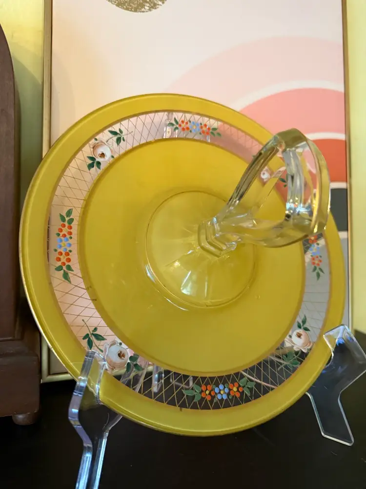 Details: • Circa 1930s–1940s • Frosted yellow glass with clear center handle • Hand-painted enamel floral border with lattice detailing • Approx. 9.5” diameter, 5” tall • Excellent vintage condition with minimal wear for age • Perfect for cookies, cupcakes, or serving small treats