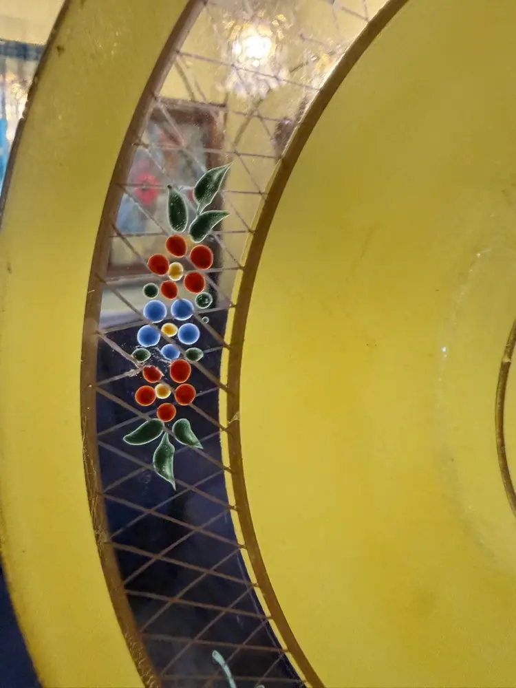 Bright and cheerful, this vintage glass serving tray features a sun-yellow frosted surface with a clear glass handle and a delicately hand-painted floral garland in enamel. The gold lattice detail adds a touch of elegance, making this a perfect piece for afternoon tea, desserts, or simply display. A wonderful accent for vintage kitchen or mid-century collections.
