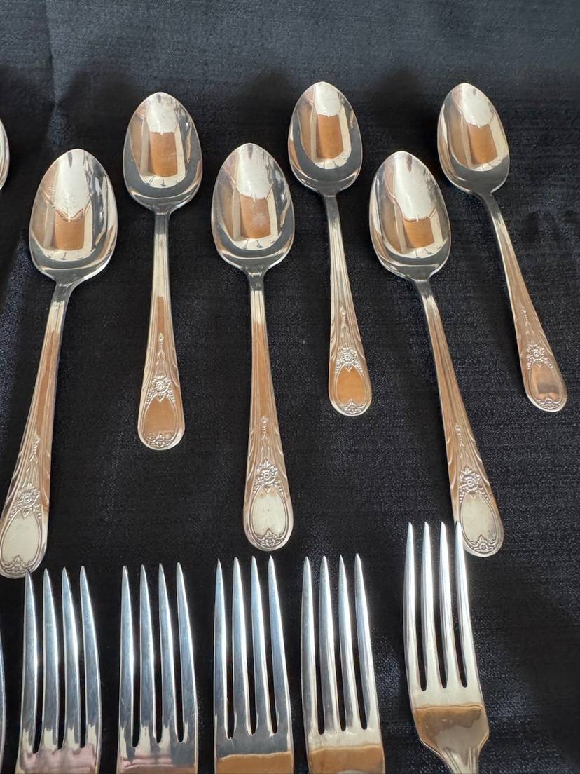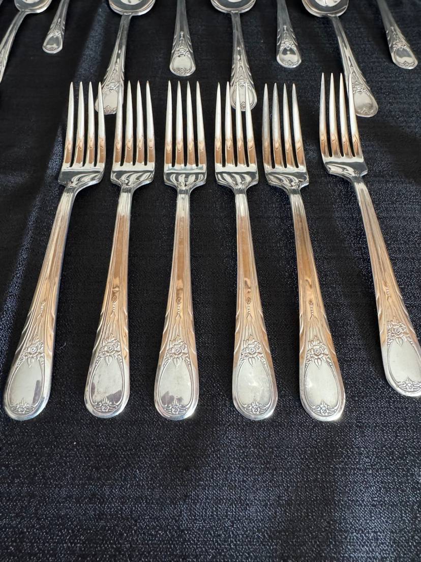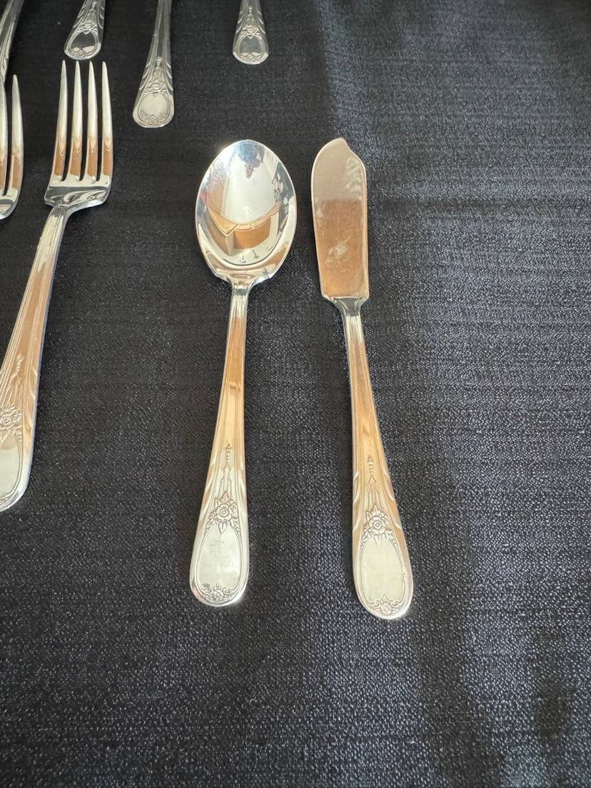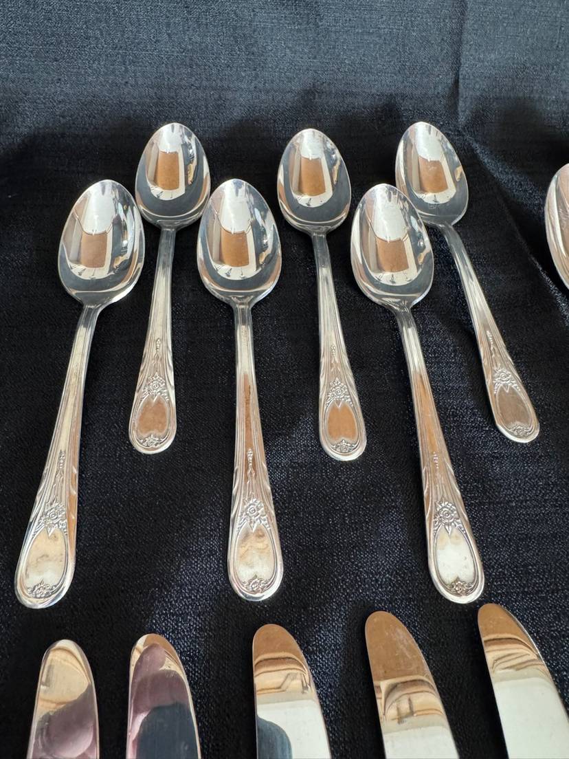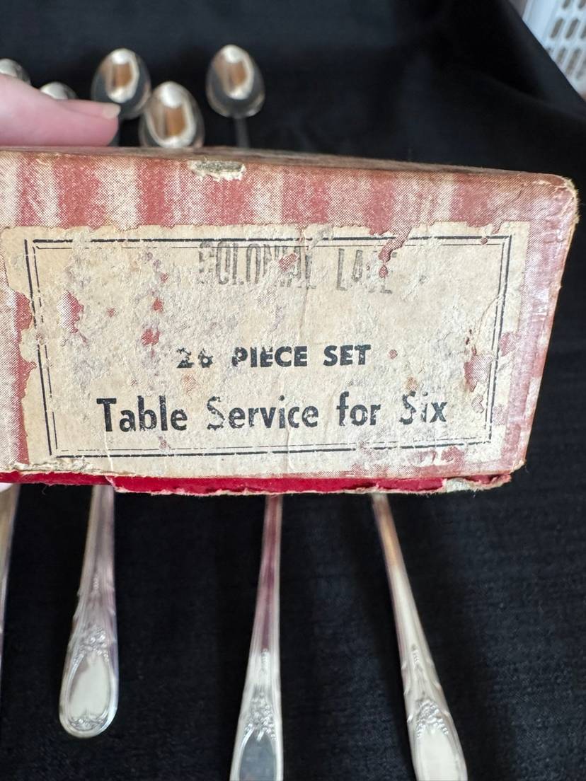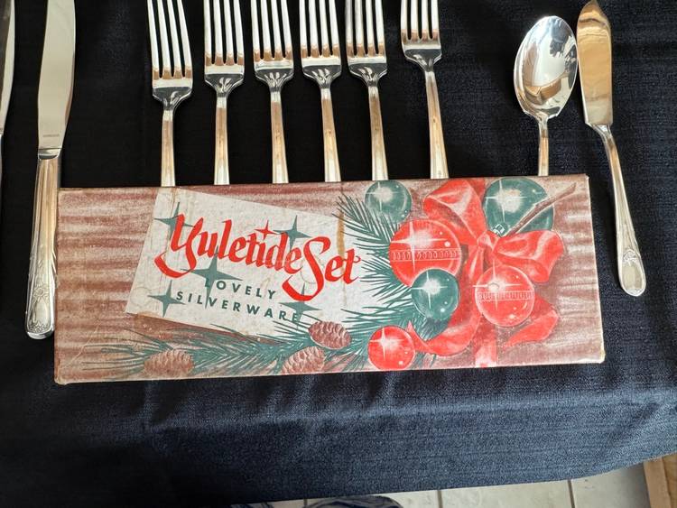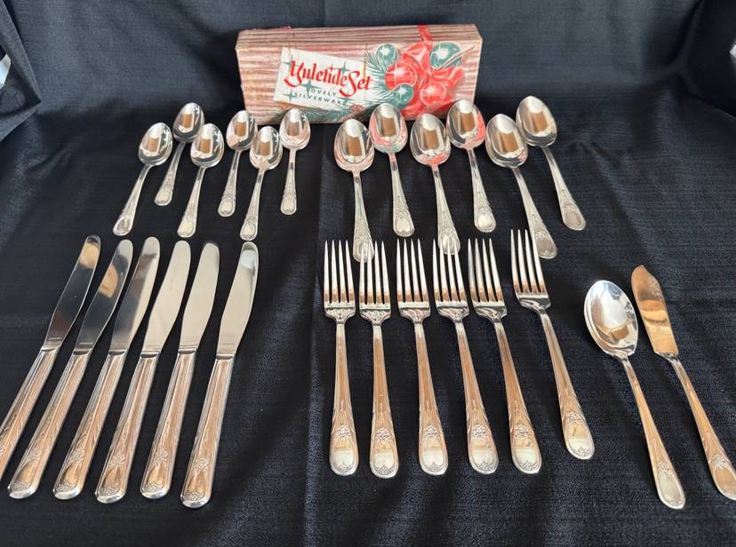 Here’s a fun set! 26 piece silverware set in original holiday box. 6 knives, 6 forks, 6 small spoons, 6 large spoons, 1 butter knife and 1 sugar spoon. All silver plate with stainless knife blades.