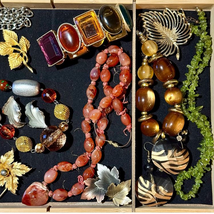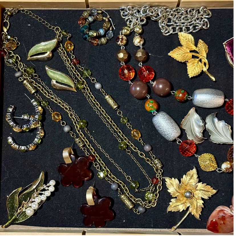 17 pieces: 6 pairs of earrings; 5 necklaces; 5 brooches; 1 bracelet.