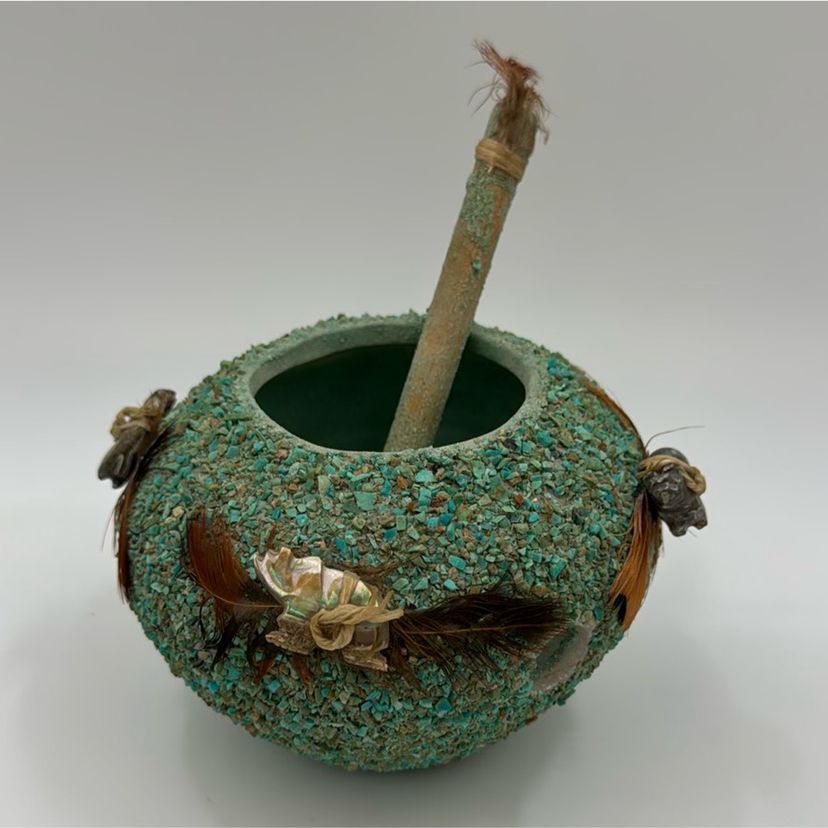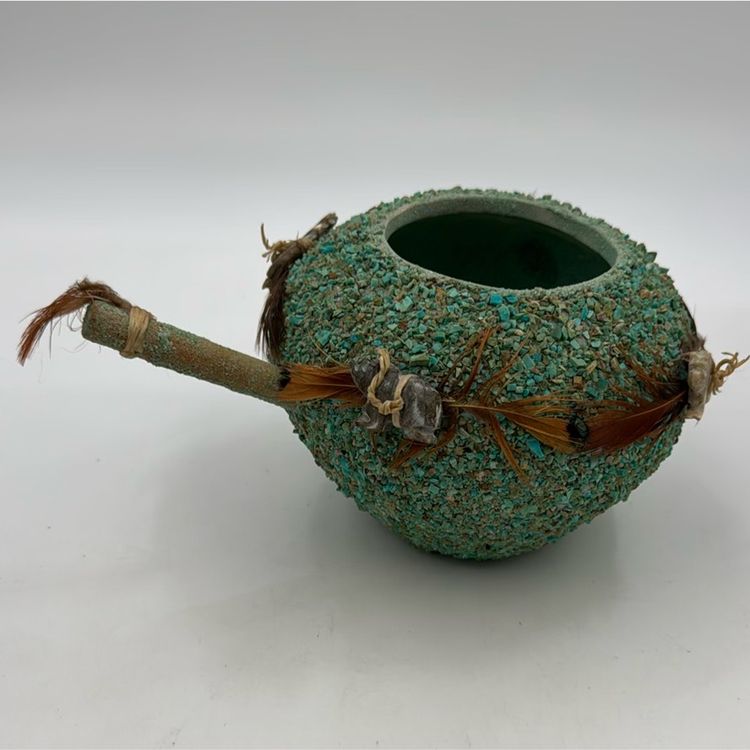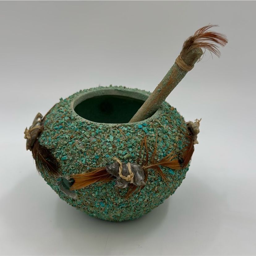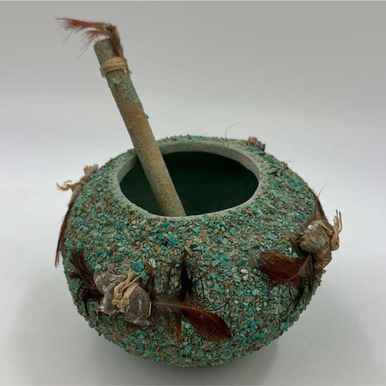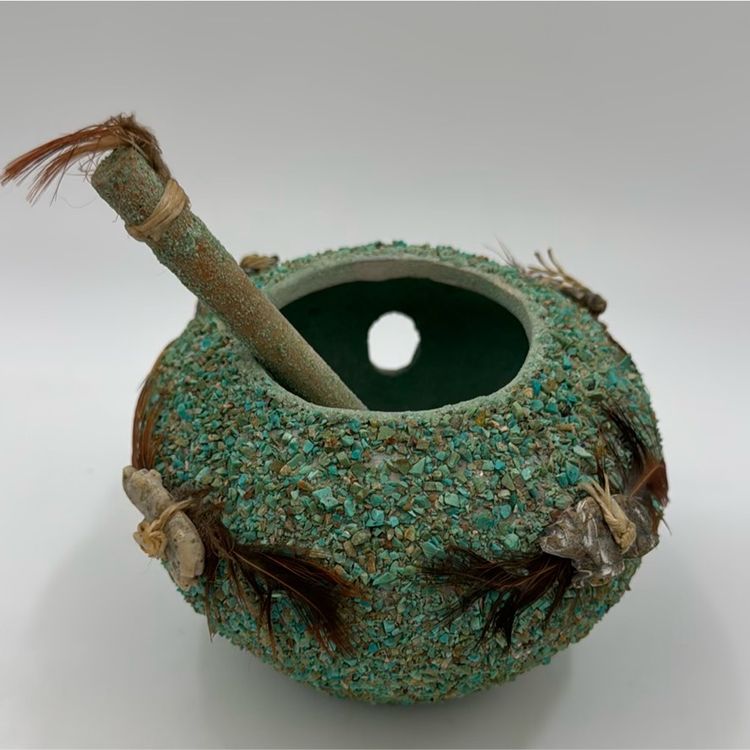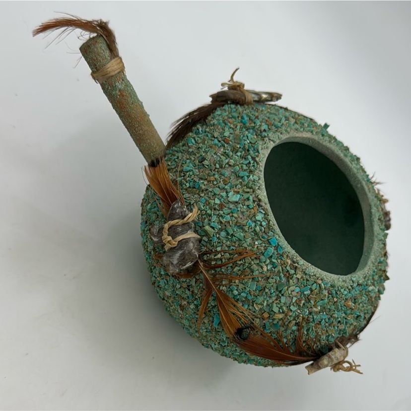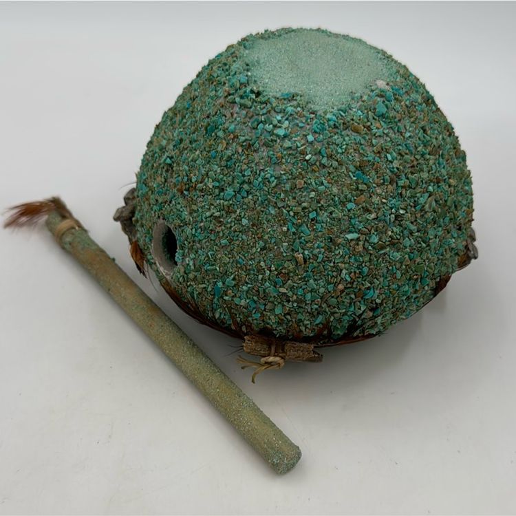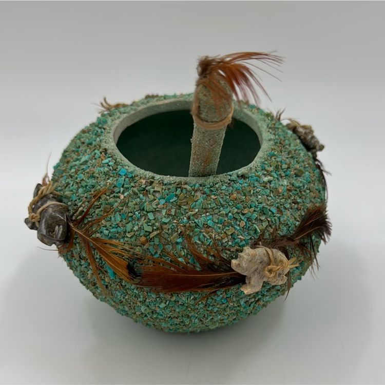 5”R 4”T no chips, cracks or breaks and wonderful condition. Native American has no makers, smart, crushed turquoise stone bears on top of feathers and it has a stick with the feather.