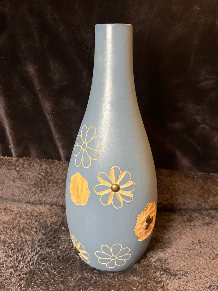 Blue Wood Vase W/ Carved Flowers Mango Wood Carving Handmade Thailand